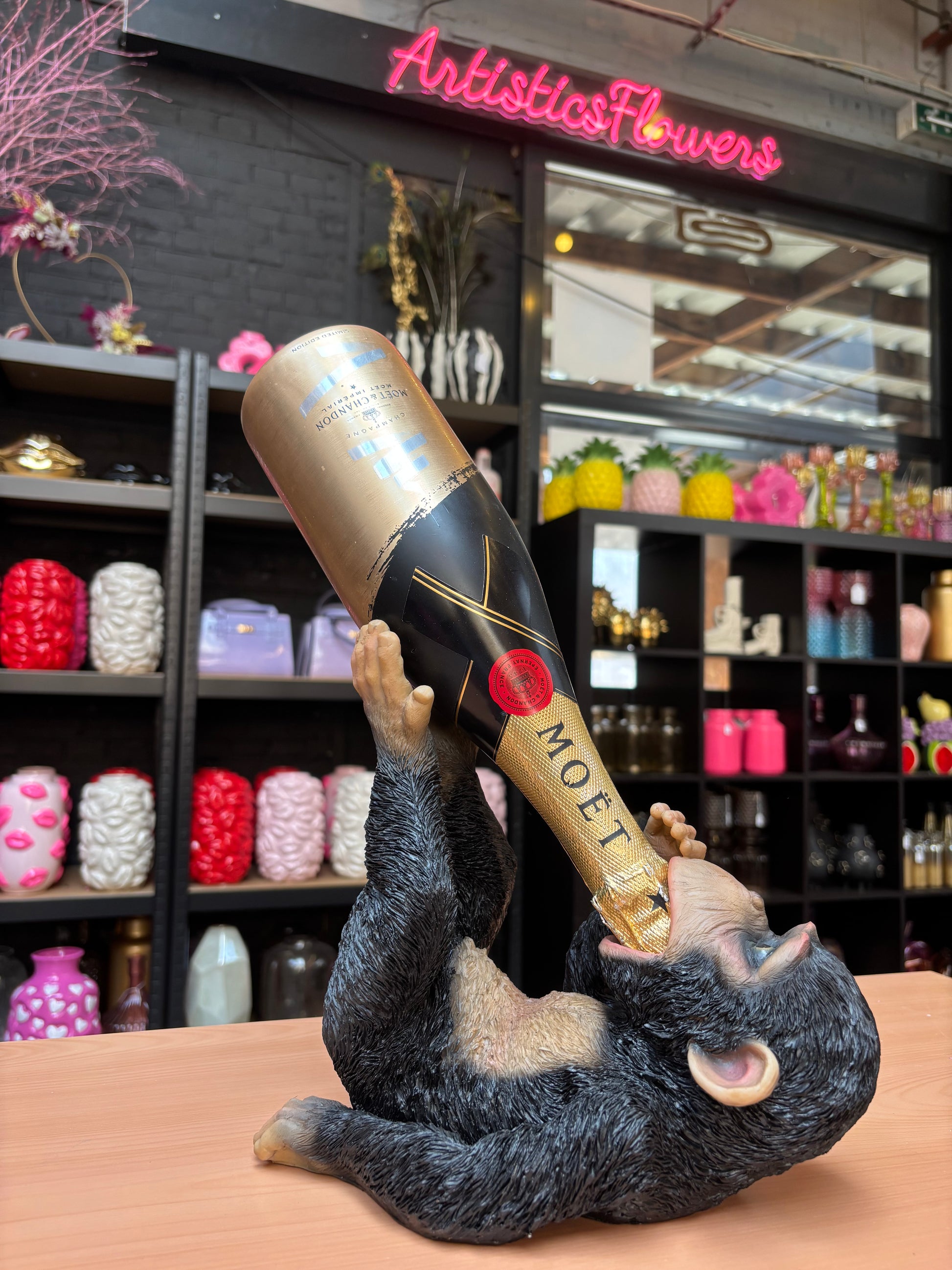 Mooie zwarte wijnrek in de vorm van een aap. Een grappige en unieke decoratie die je ruimte een speelse en bijzondere uitstraling geeft.
