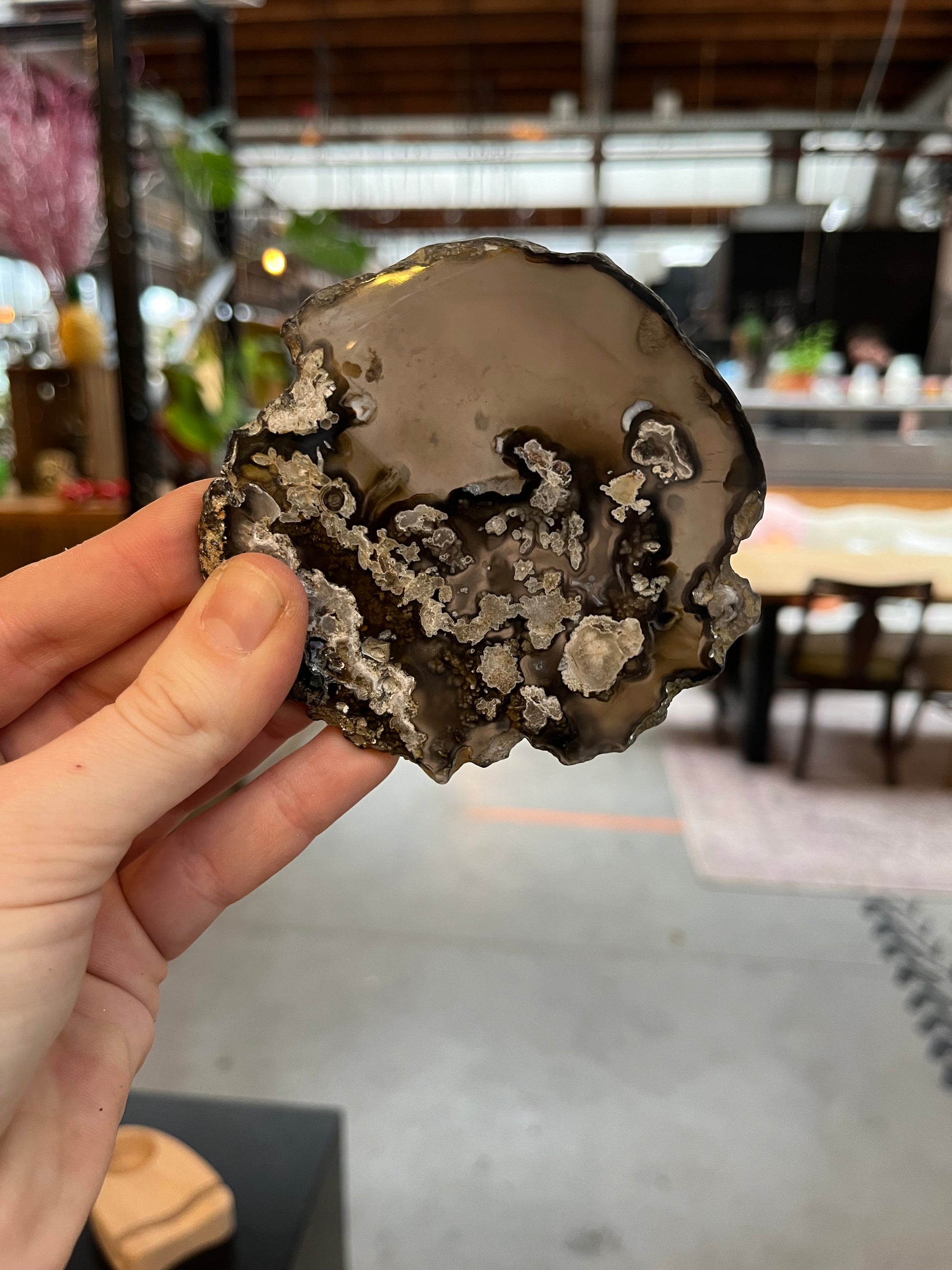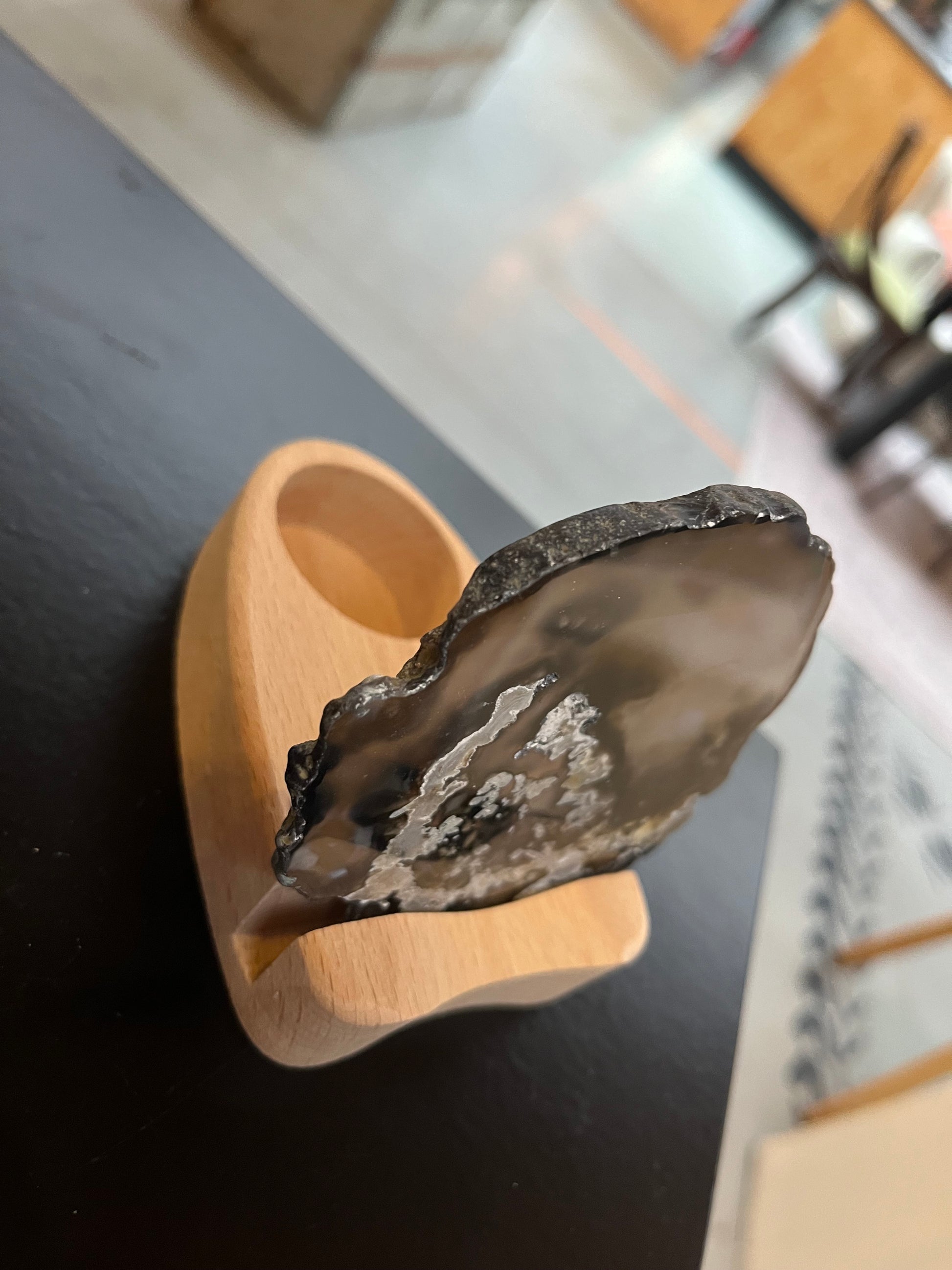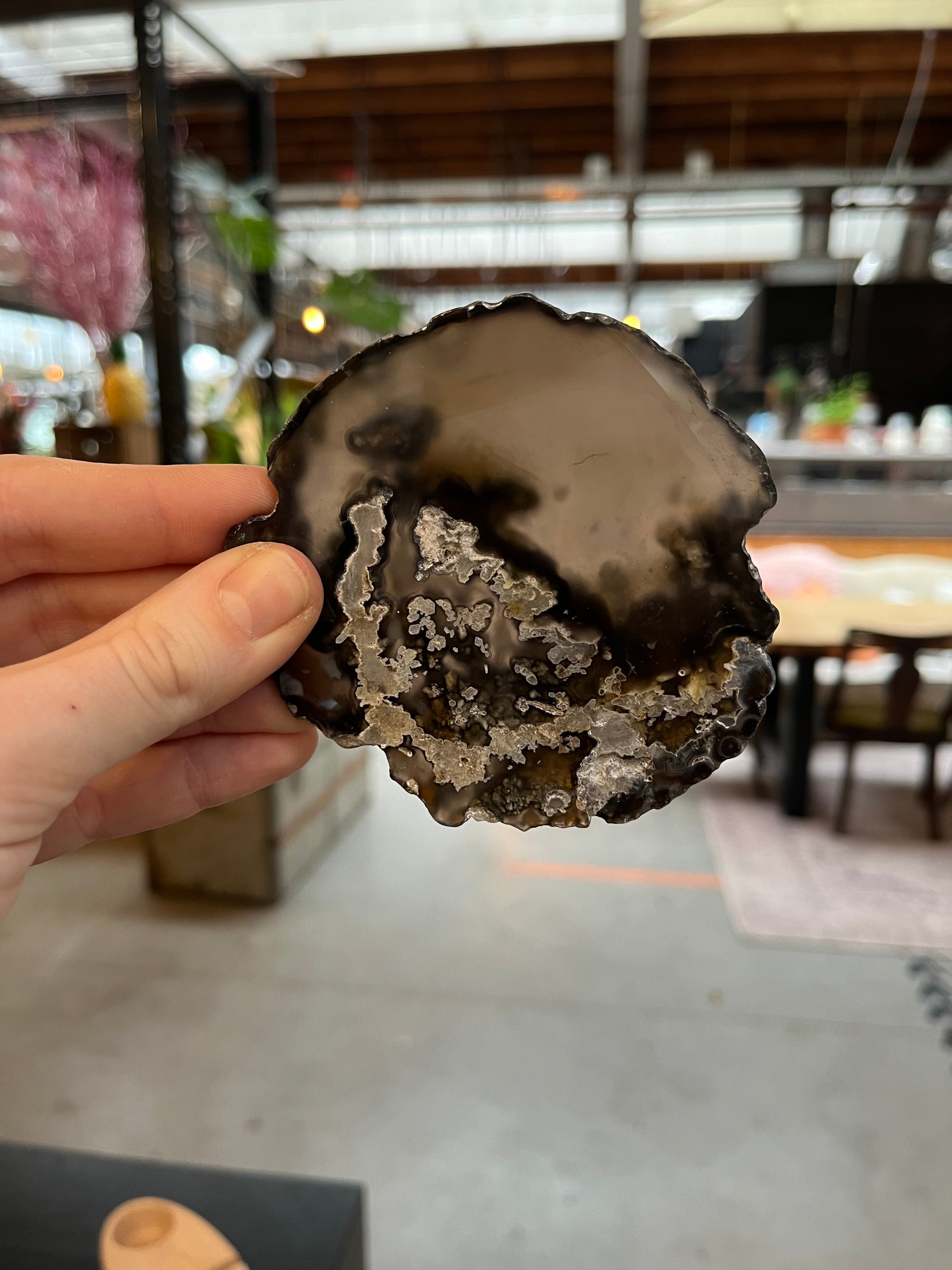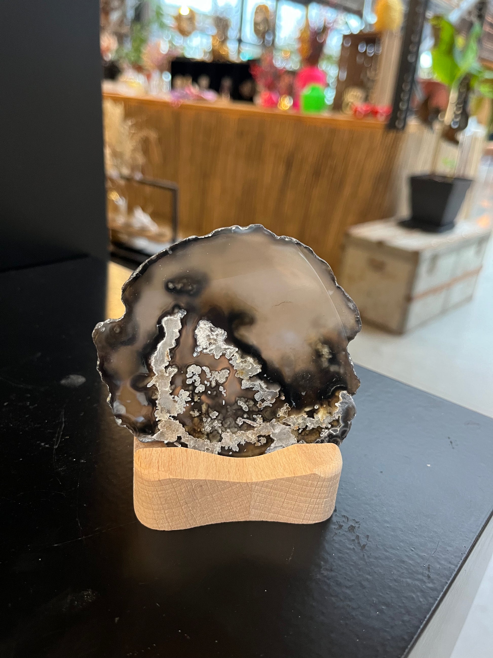 Agaat schijfje inclusief voetje. Brand een waxinelichtje achter het schijfje. Schijfje circa 9 cm. Voetje 11 cm.
