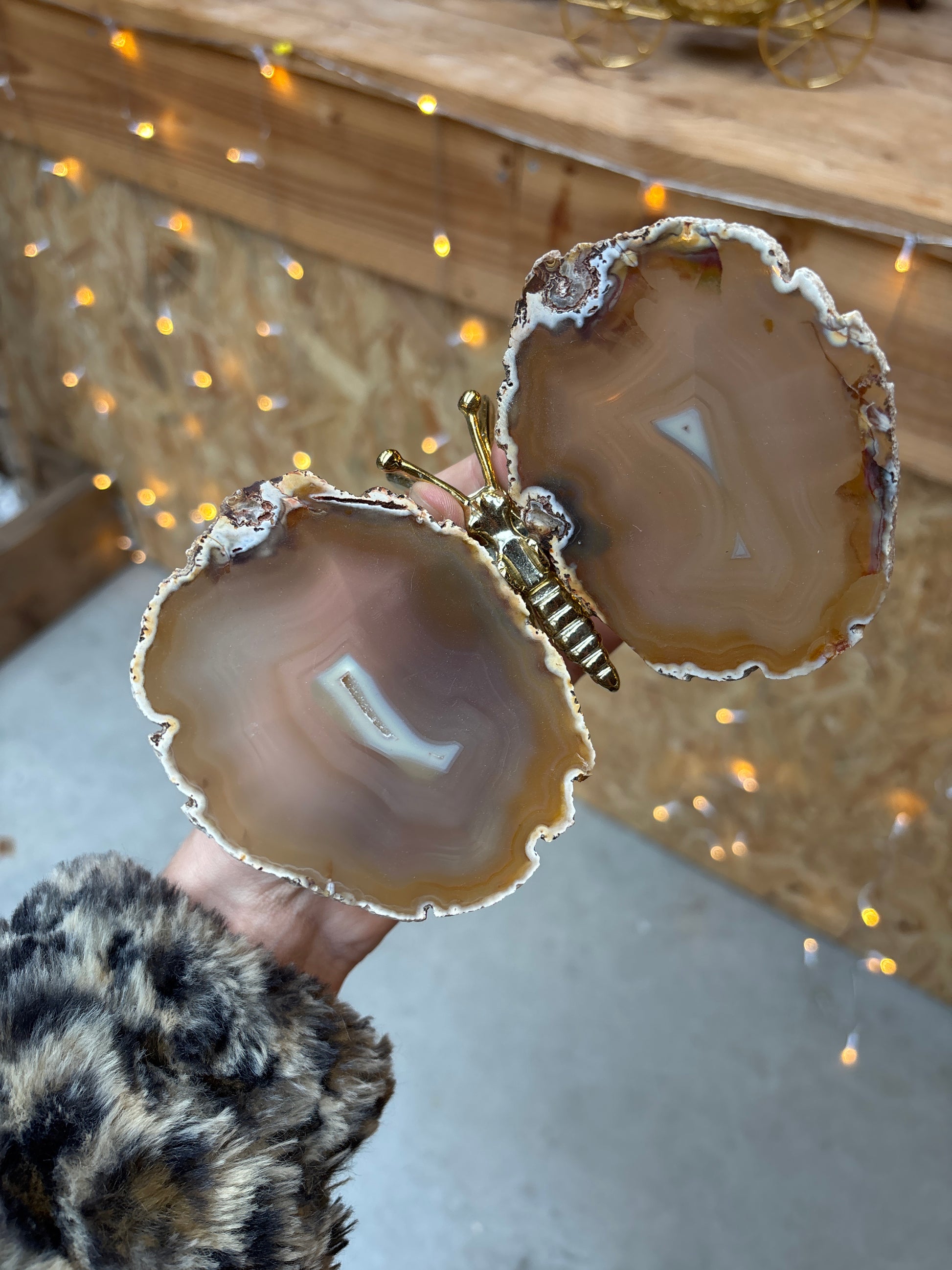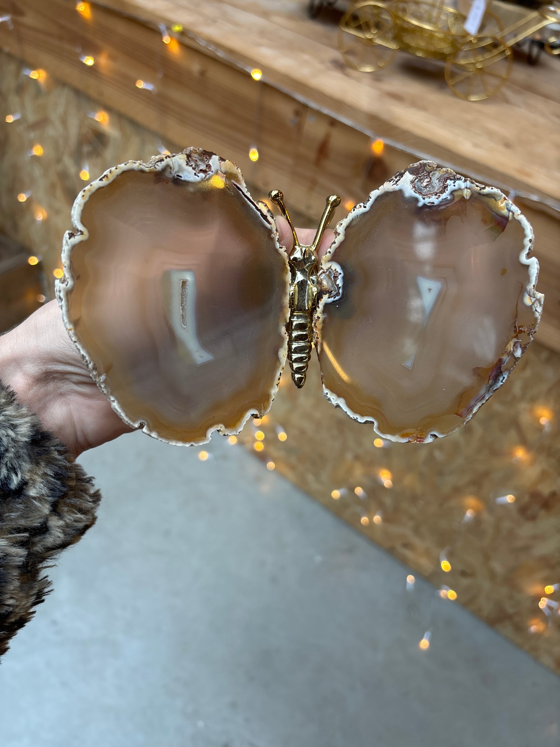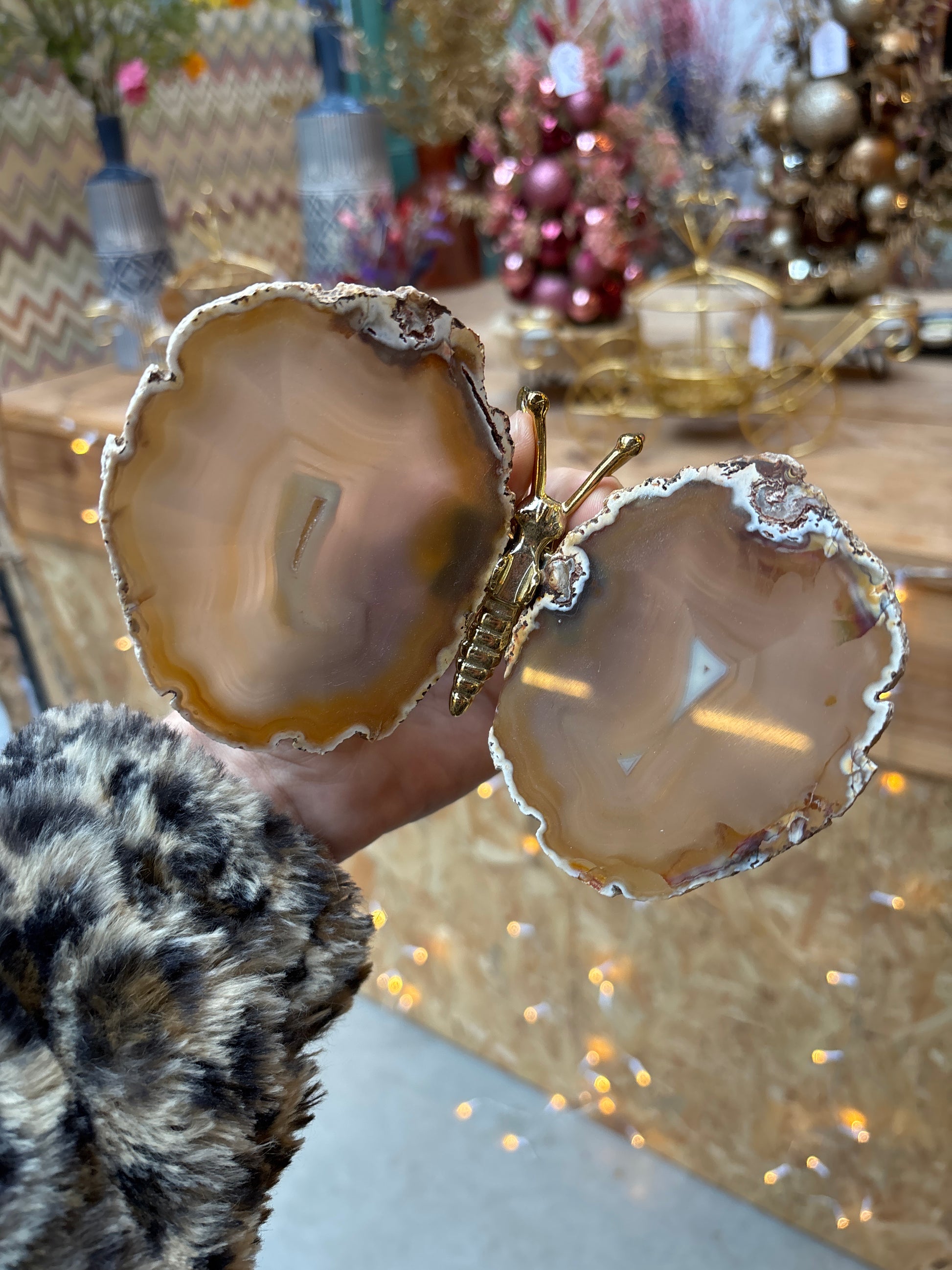 Prachtige vlinder met vleugels van agaat en een goud lijfje. De vlinders variëren tussen de 13/16 cm breed en 12/15 cm lang.