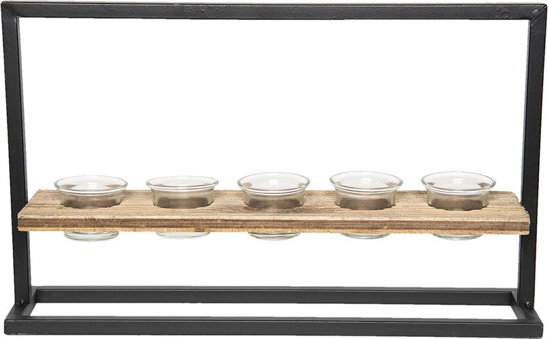 Theelichthouder van hout in bruine afwerking met metalen frame in matzwart en uitsparingen met 5 glazen theelichthouders van het merk Clayre & Eef in moderne stijl met een landelijke uitstraling