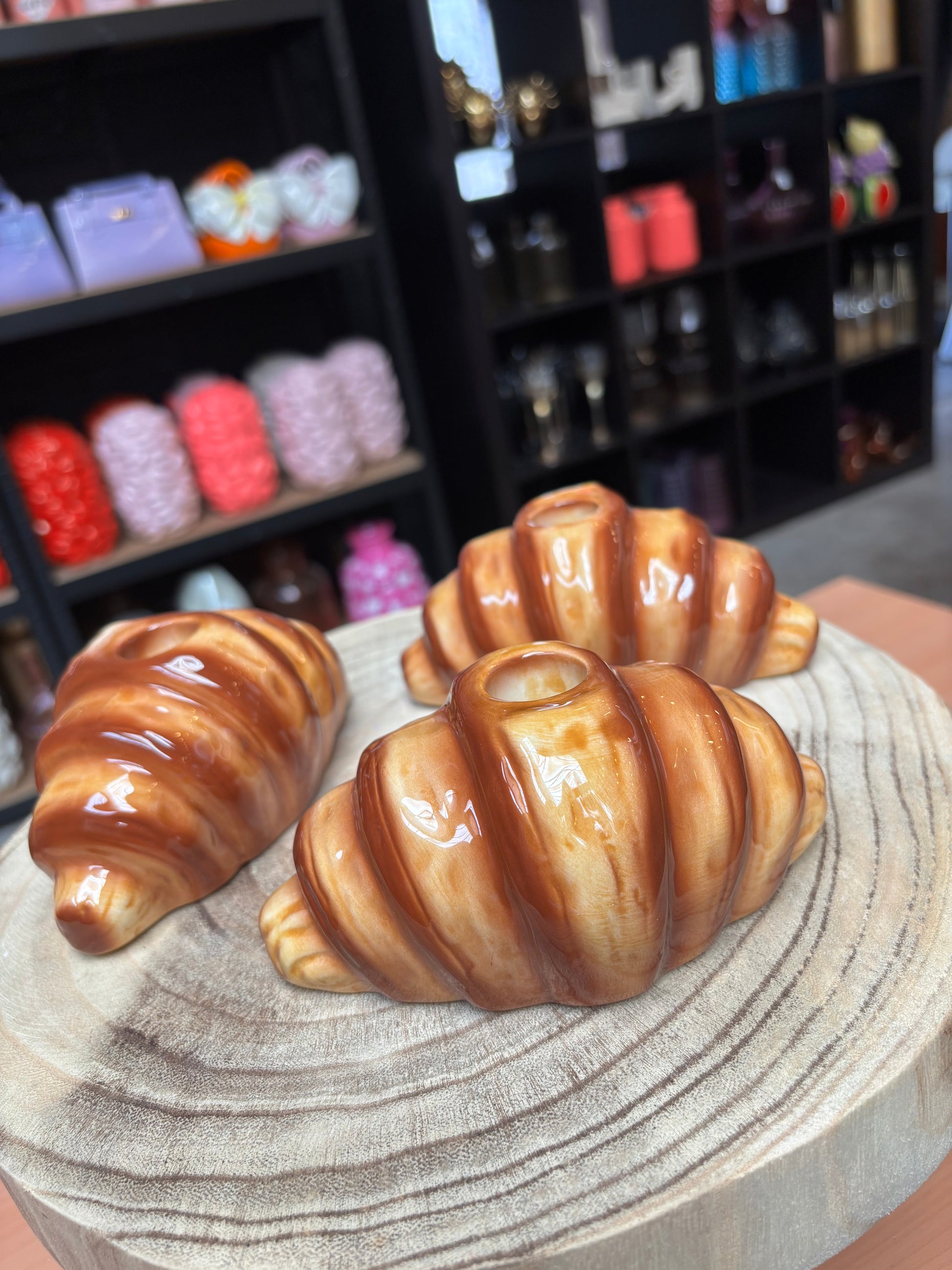 Maak je klaar voor een knotsgek detail in huis! Deze aardewerk kaarsenstandaard 'Croissant' is allesbehalve standaard en zal direct een glimlach op je gezicht toveren. Met zijn compacte afmetingen van 14,4x8,5x6,4cm en unieke design is dit een origineel hebbeding dat de aandacht trekt. Geschikt voor een dinerkaars, voegt hij een speels en vrolijk accent toe aan elke ruimte.