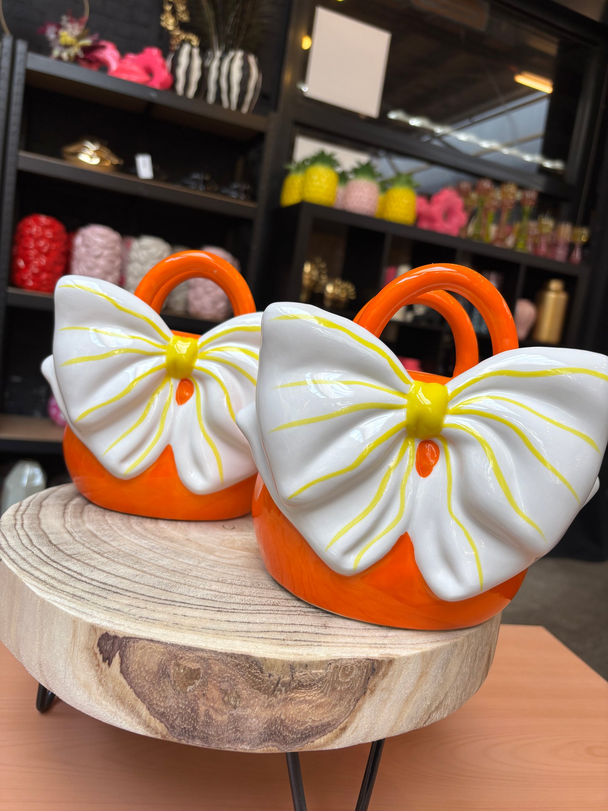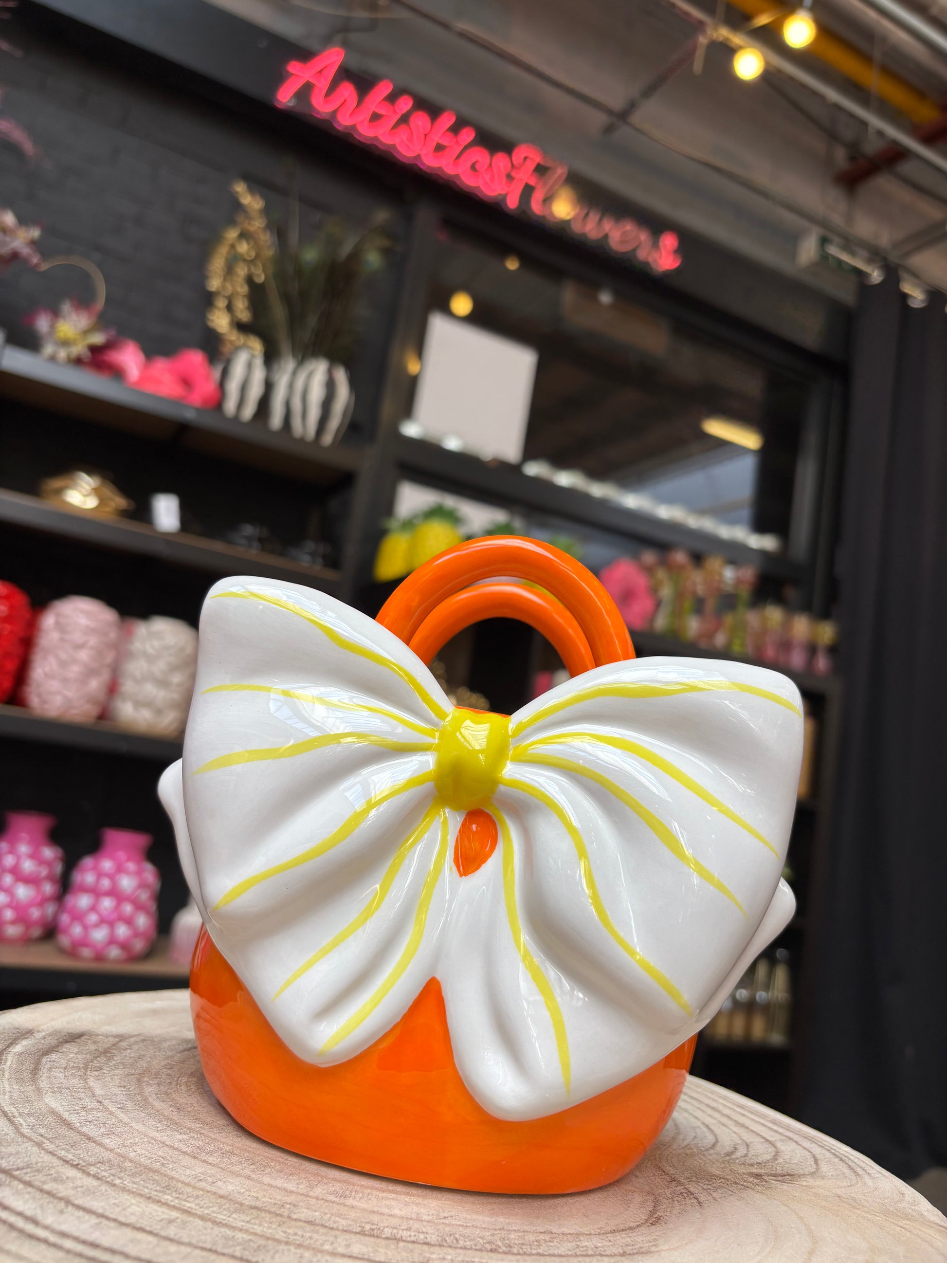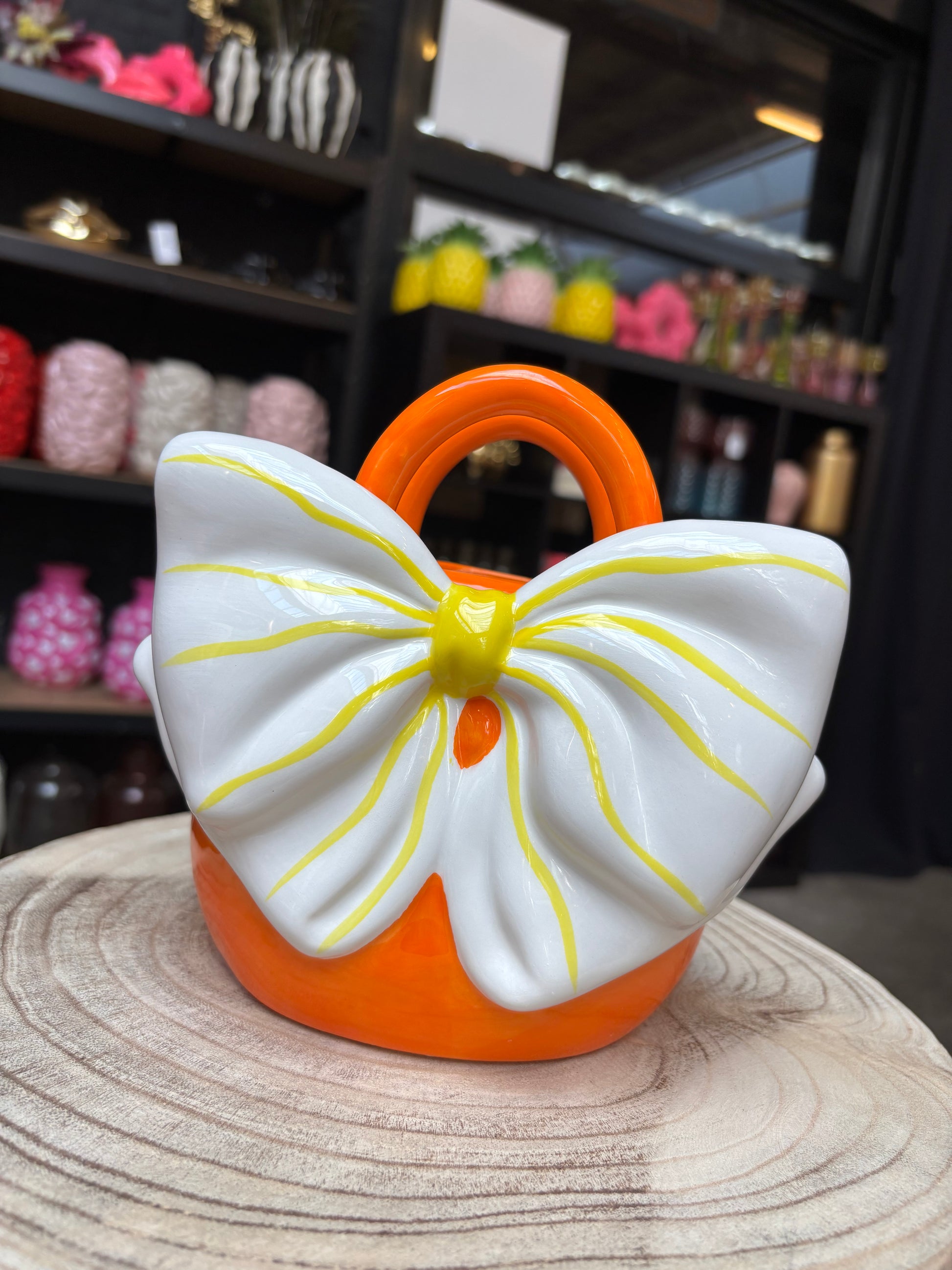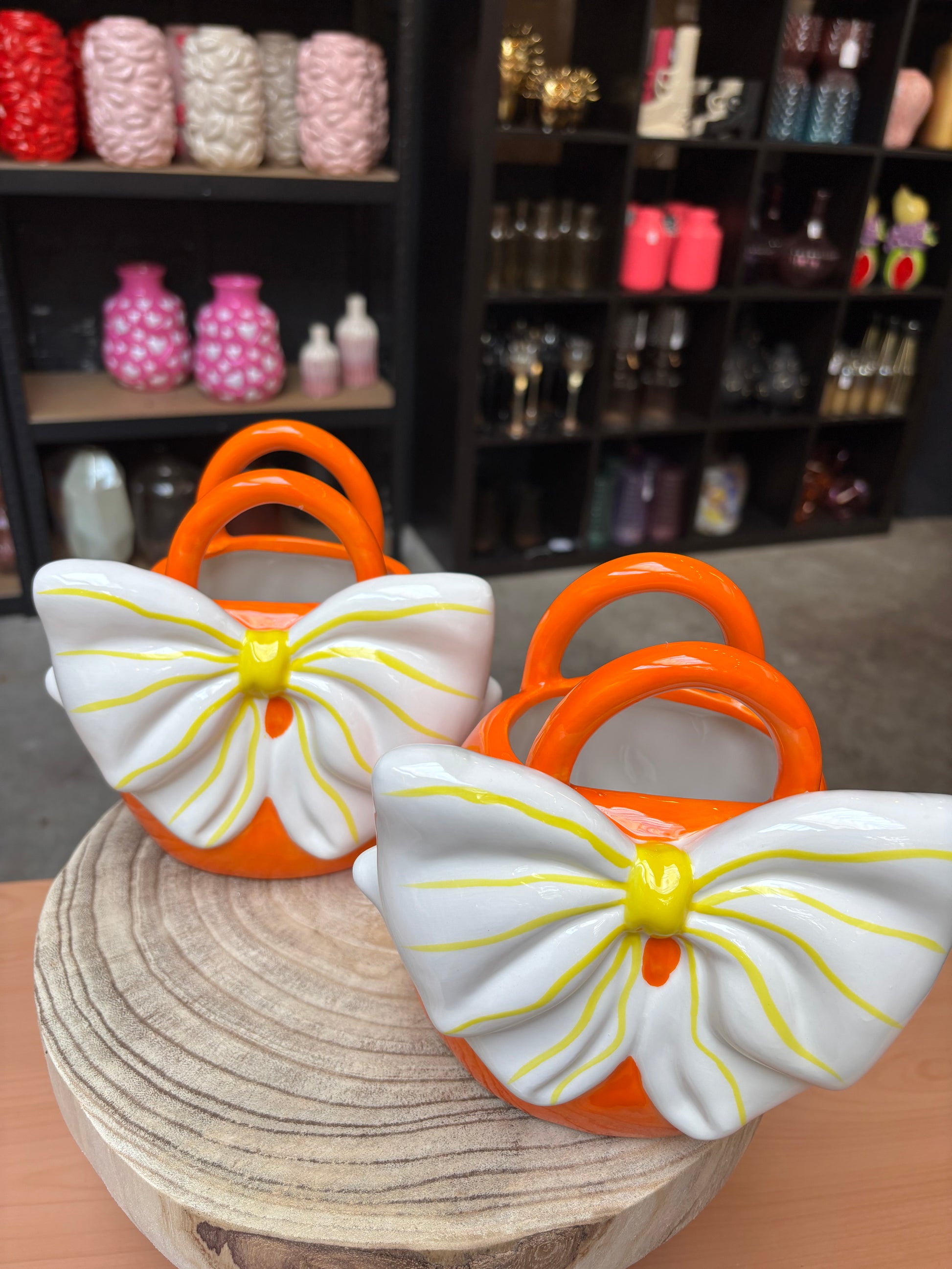 Schattige bloemenvaasjes in de vorm van een handtas met strik gemaakt van geglazuurd keramiek. Deze waterdichte vaasjes zijn geschikt voor echte, droogbloemen of kunstbloemen en zijn zeer decoratief in je interieur. 18x17 cm.