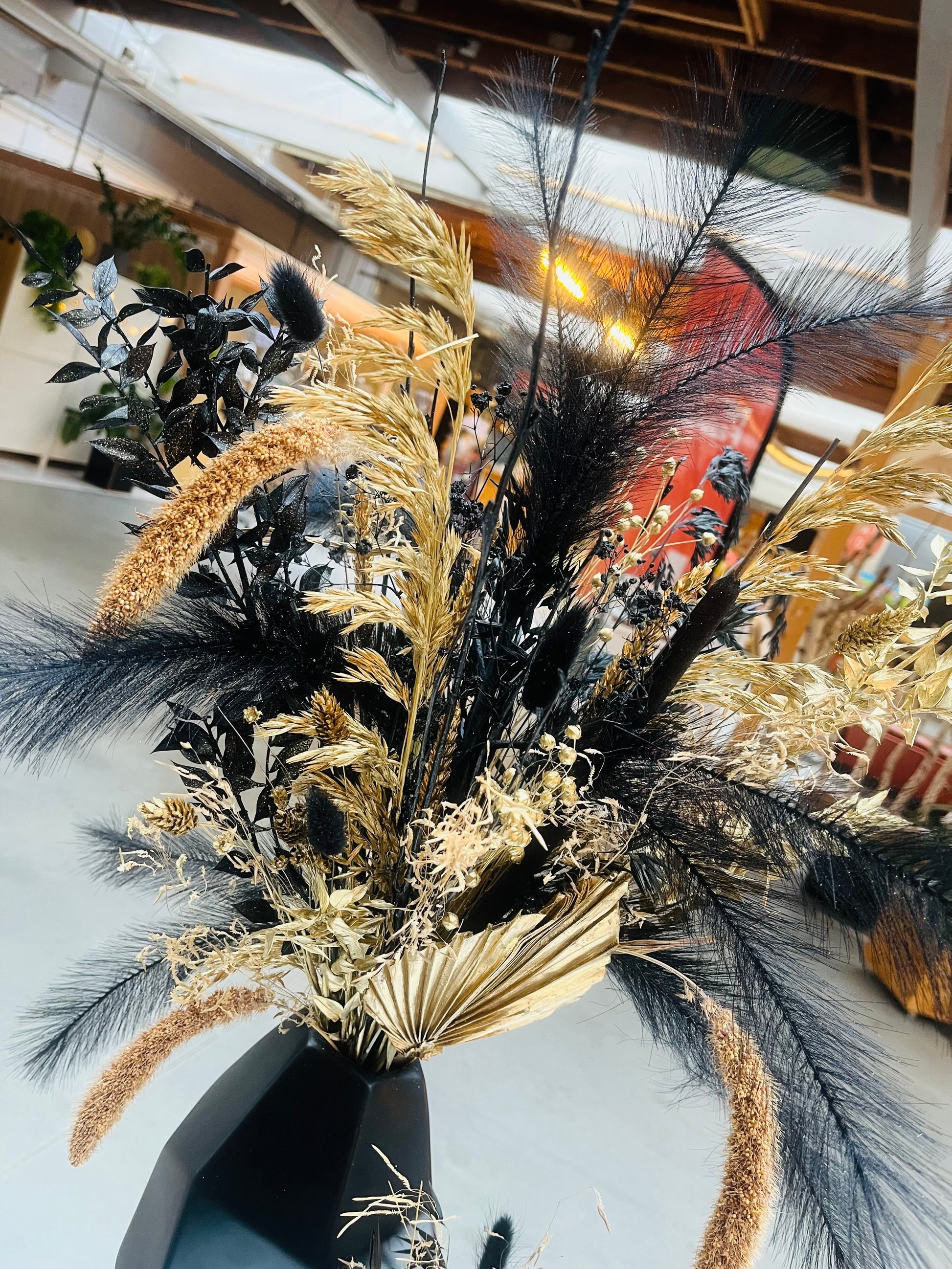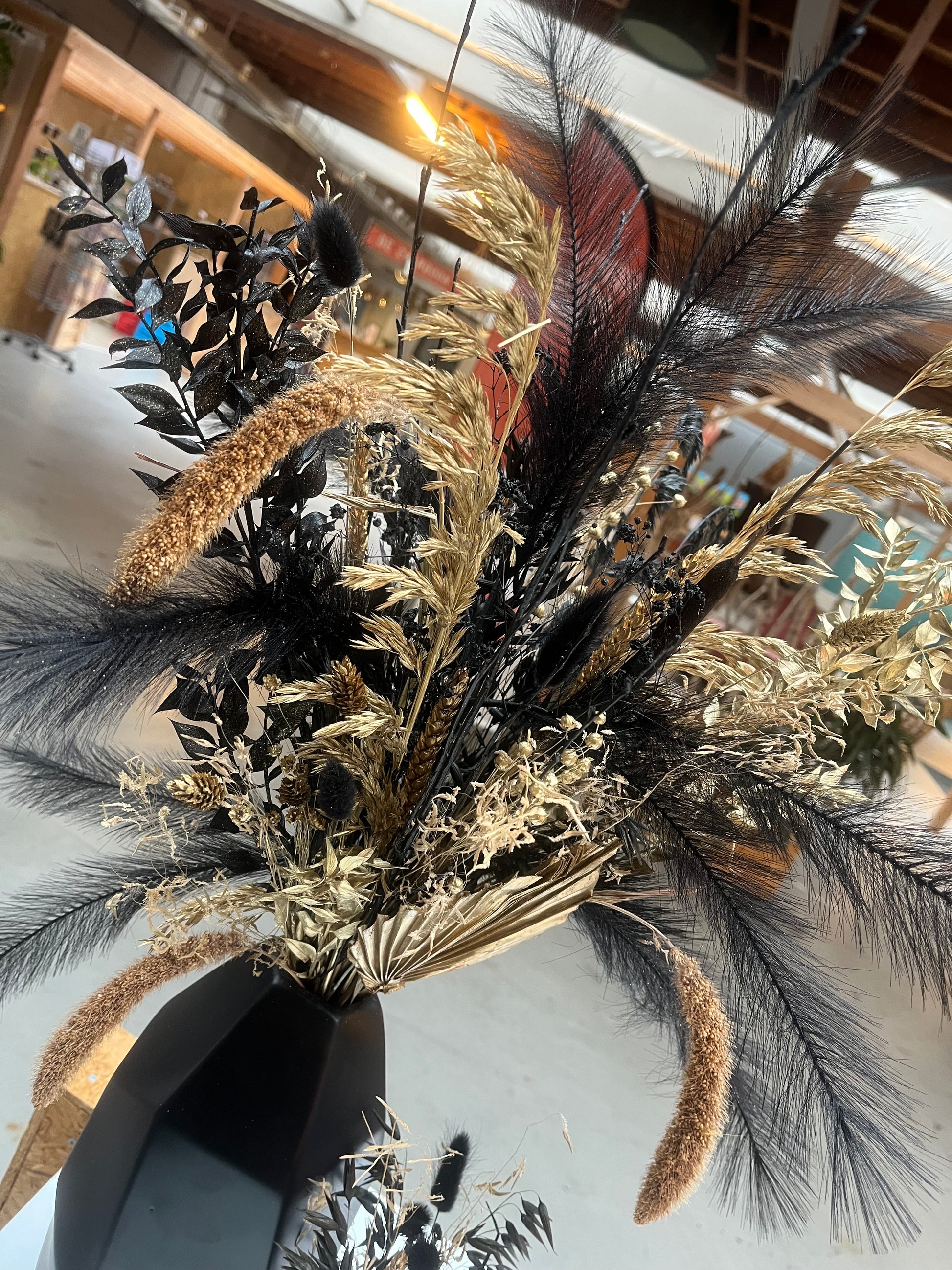 Dit boeket is samengesteld met gouden en zwarte glitter droogbloemen waardoor het een chique uitstraling krijgt. Inclusief zijdepluim. Hoogte circa 70 cm.