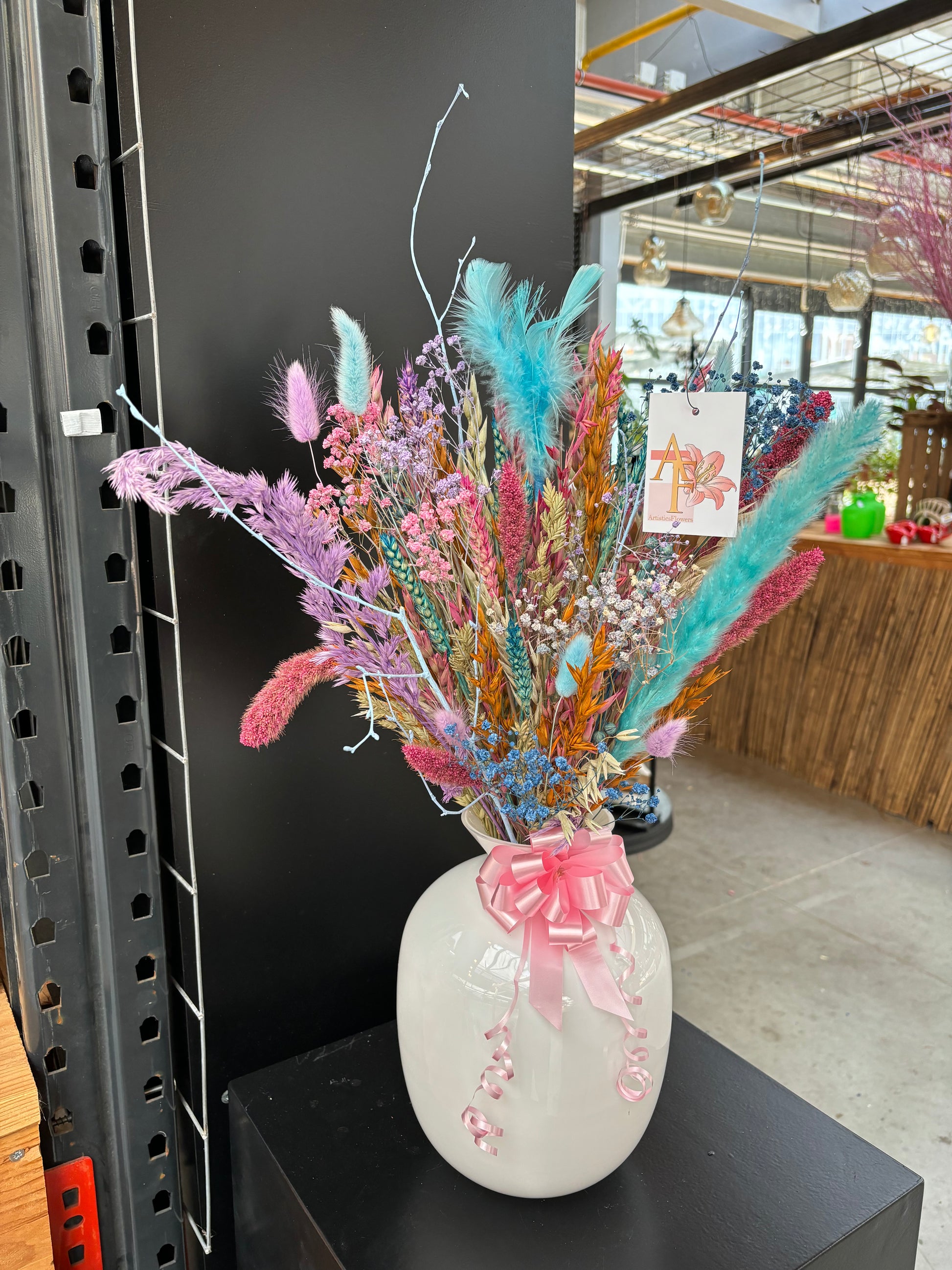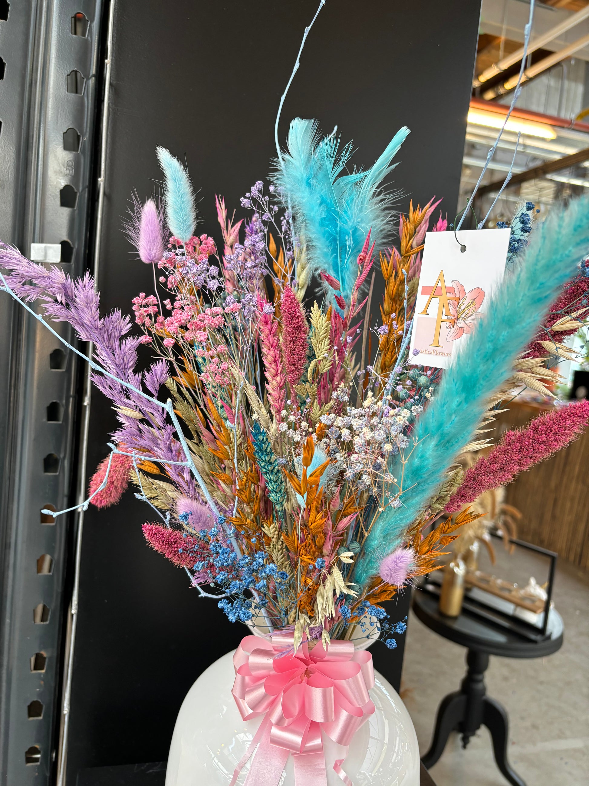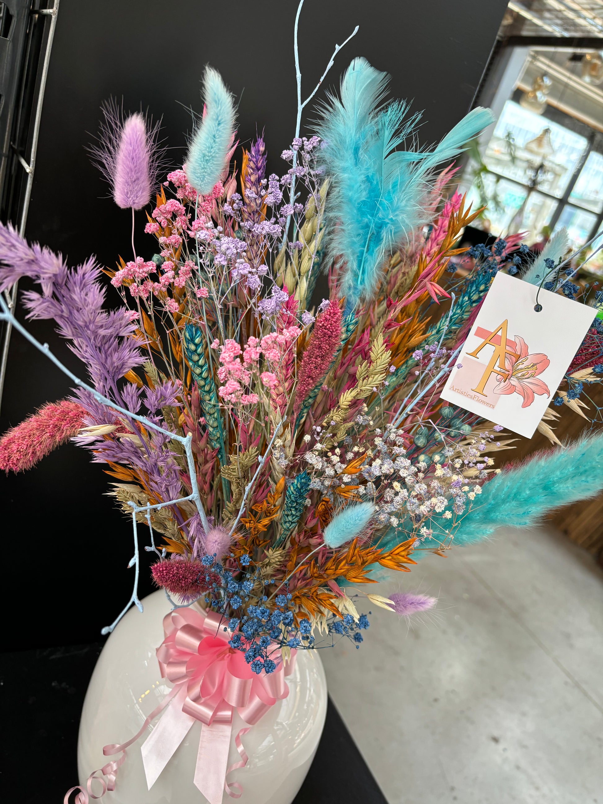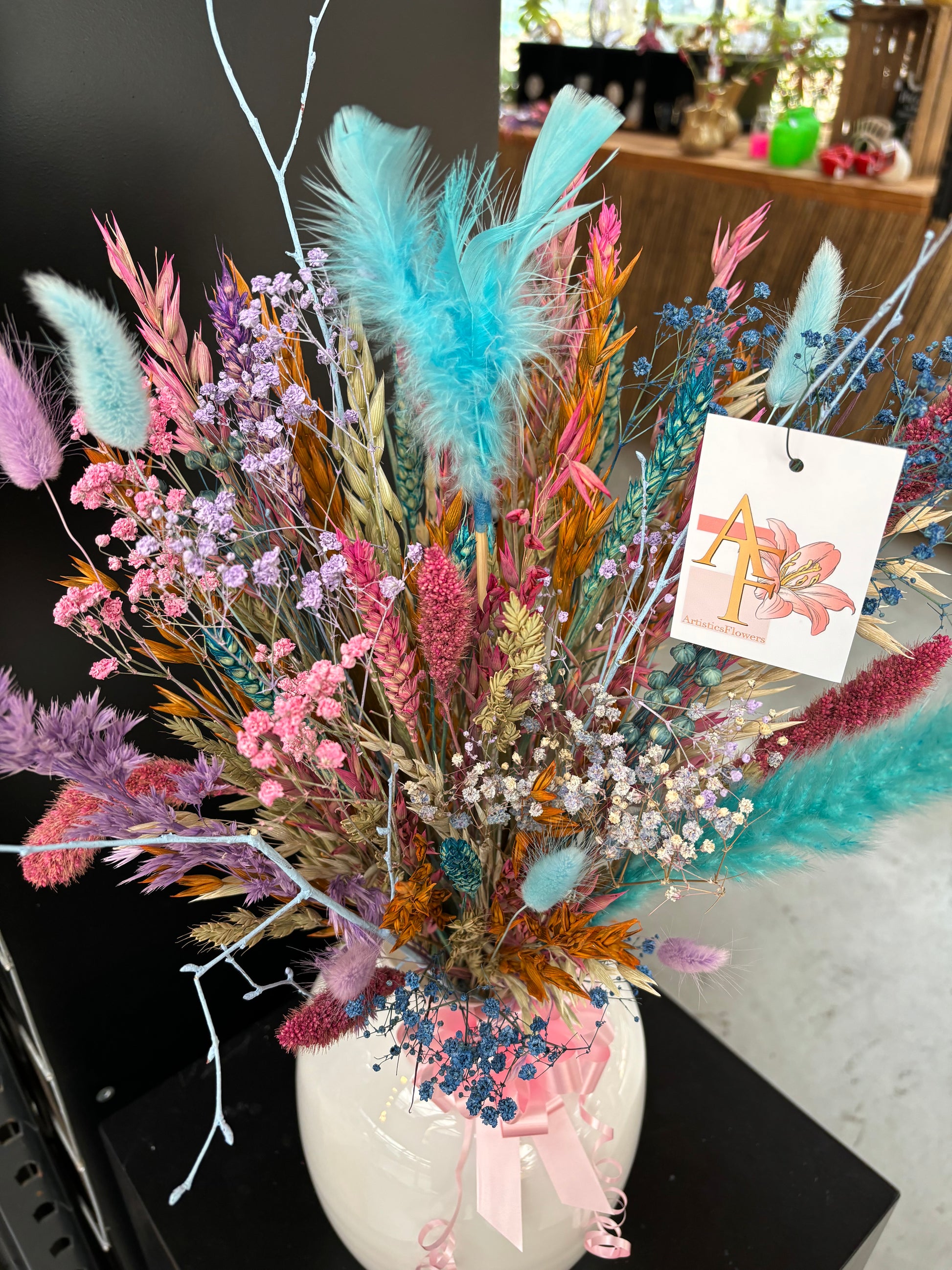 Het kan voorkomen dat een bepaald soort droogbloem niet meer voorradig is. Deze vervangen we dan voor een soortgelijke bloem, waardoor de uitstraling hetzelfde blijft.