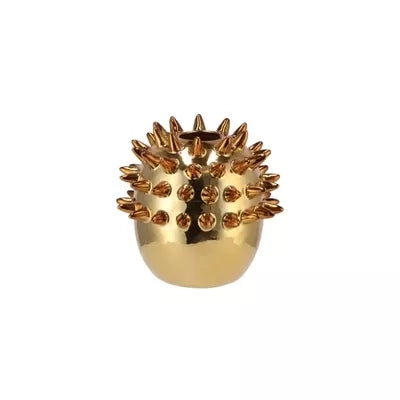 De vaas heeft spikes op de bovenste helft en is goudkleurig afgewerkt met een hoogglans finish.