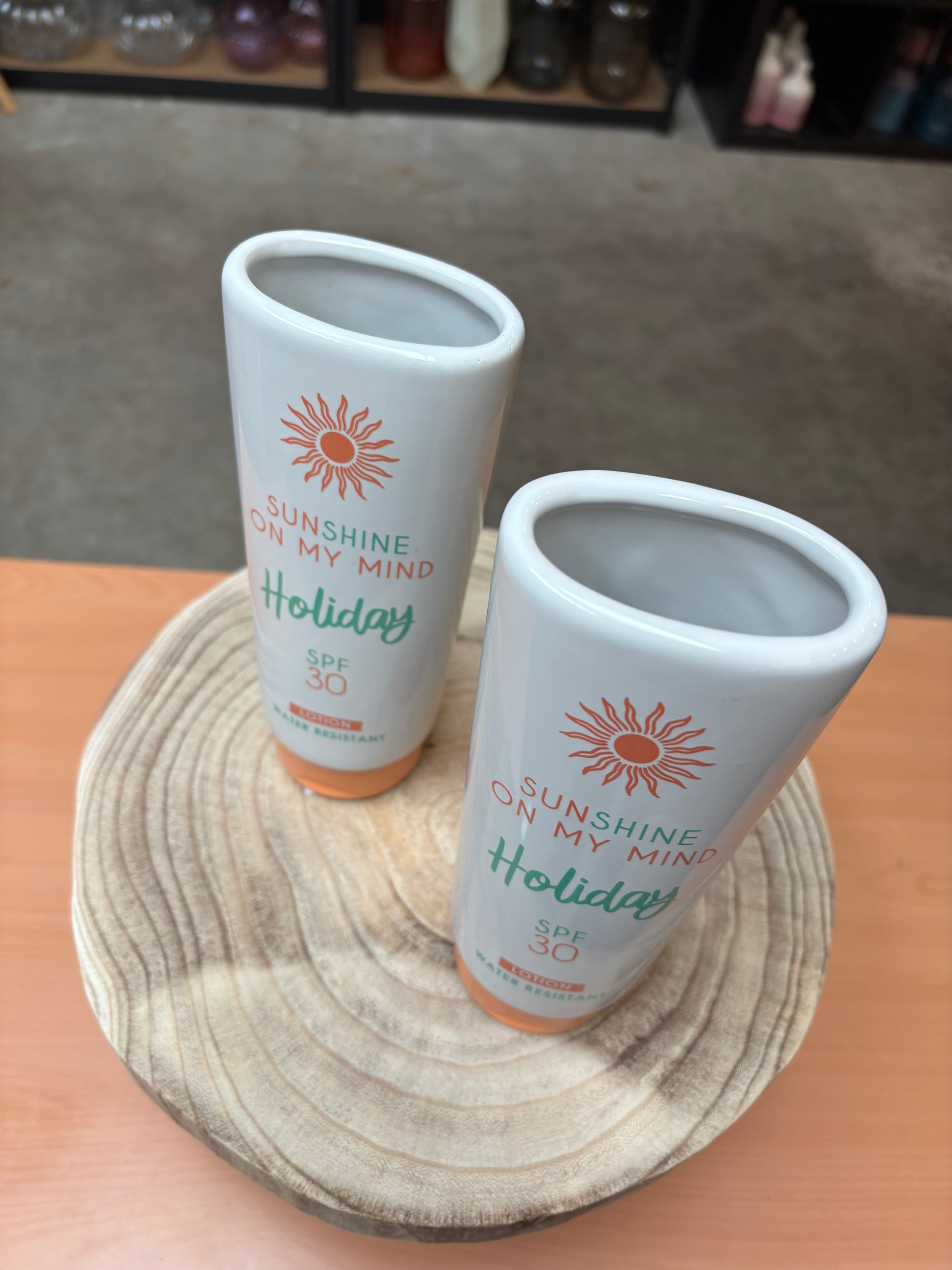 Vaas met het uiterlijk van een zonnebrand fles.