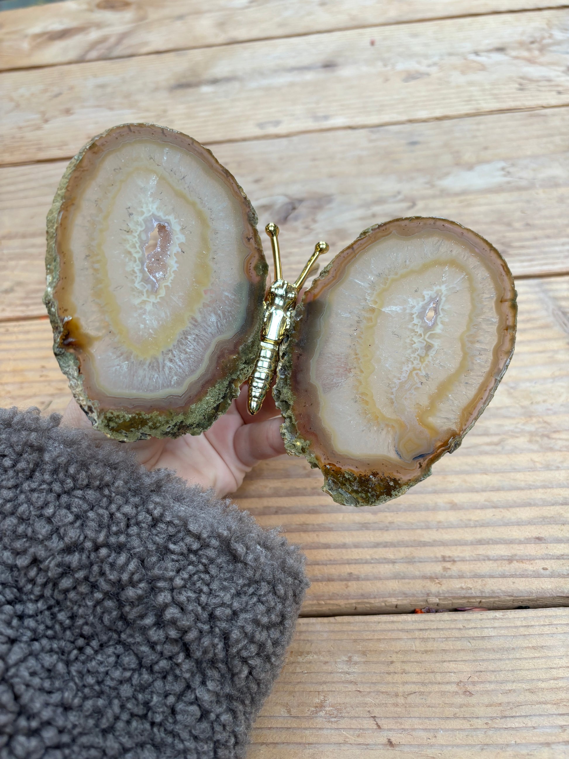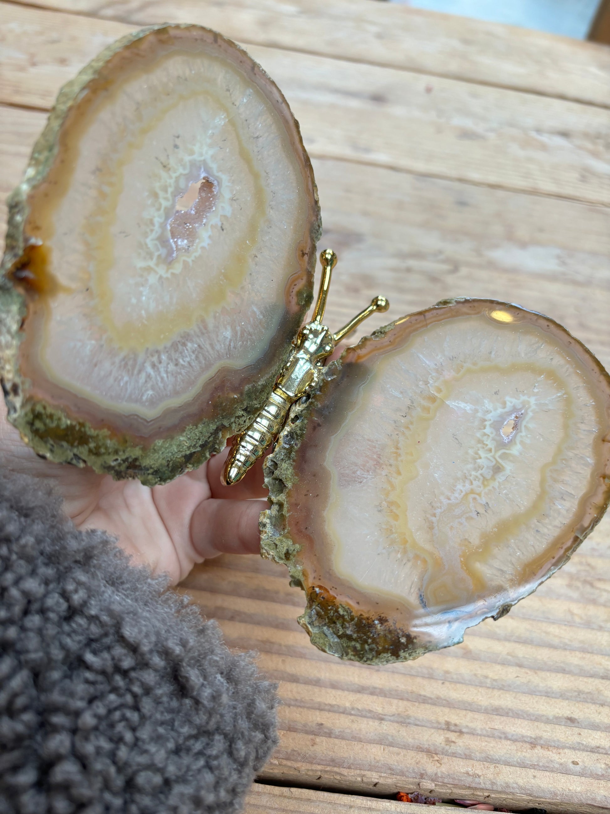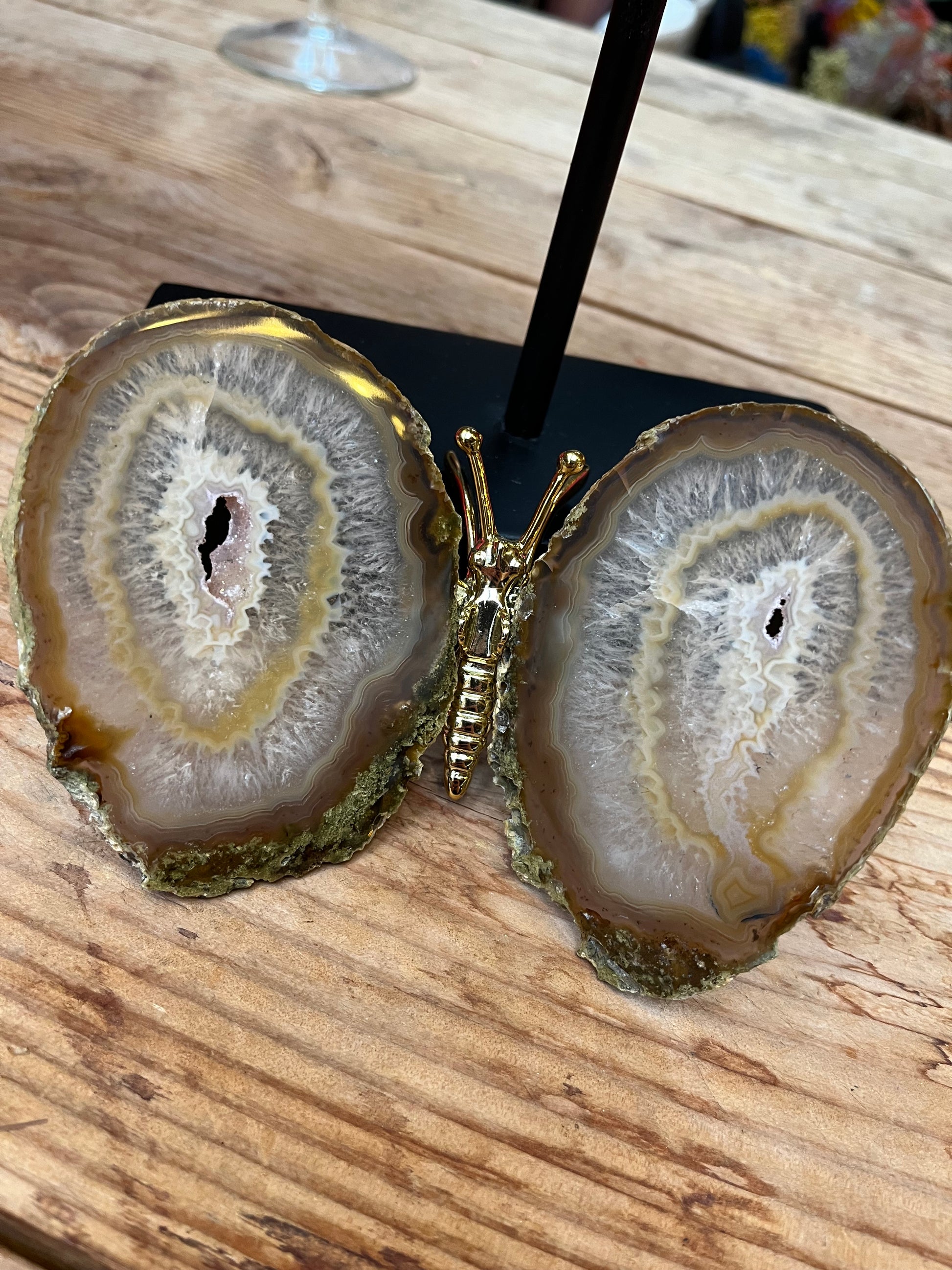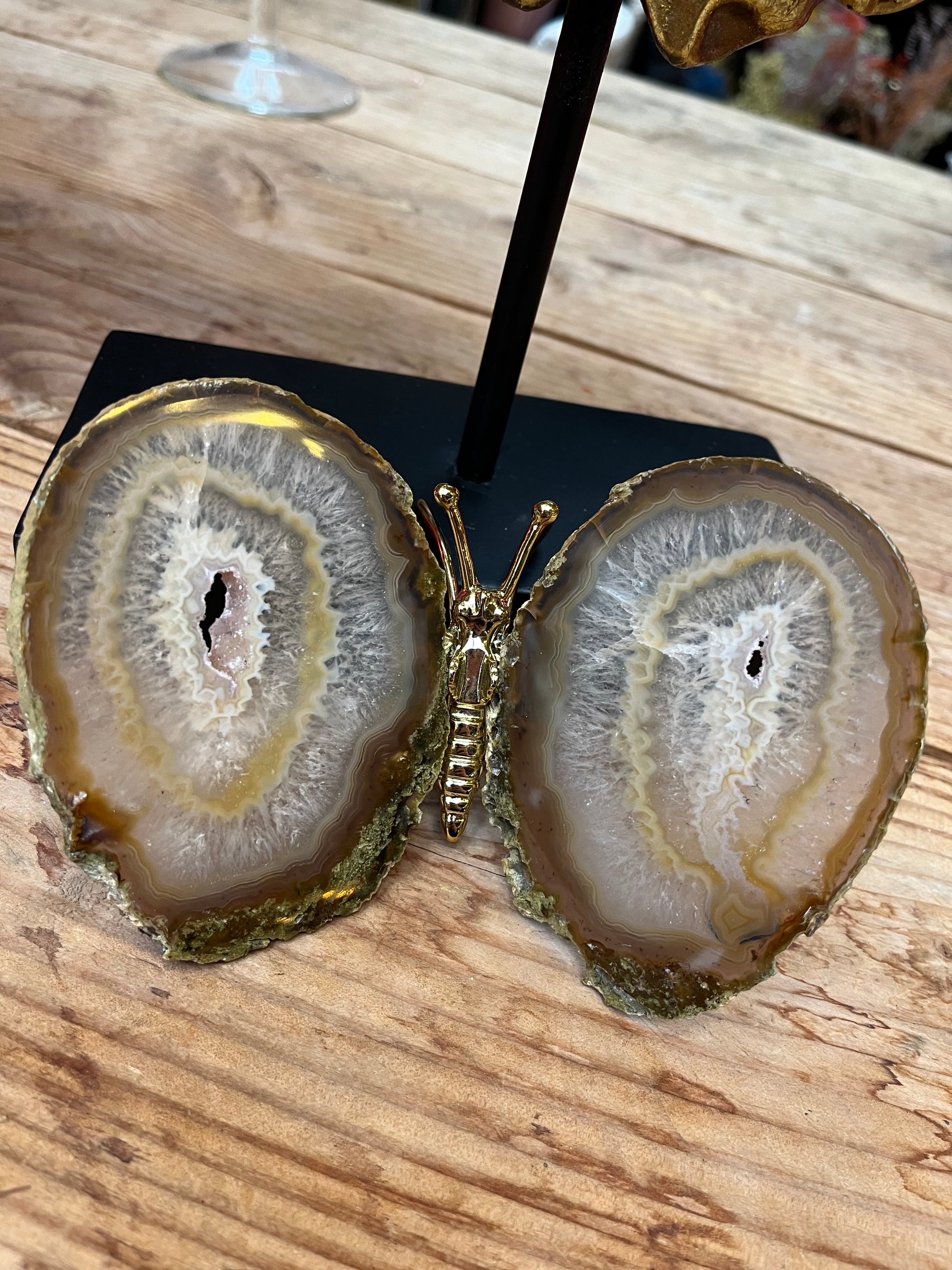 Prachtige vlinder met vleugels van agaat en een goud lijfje. De vlinders variëren tussen de 13/16 cm breed en 12/15 cm lang.