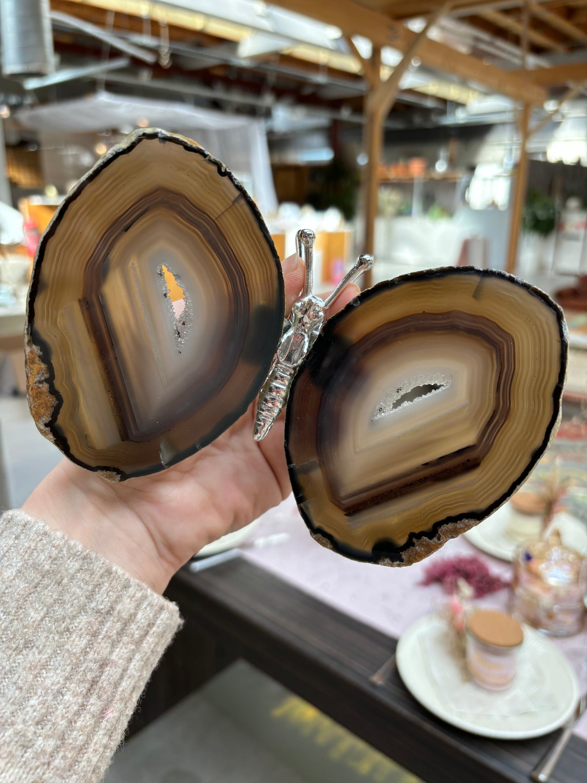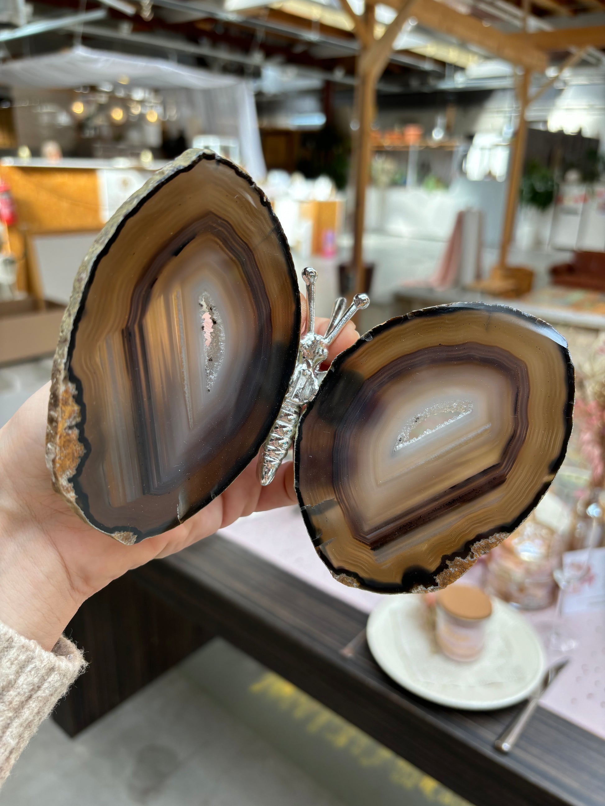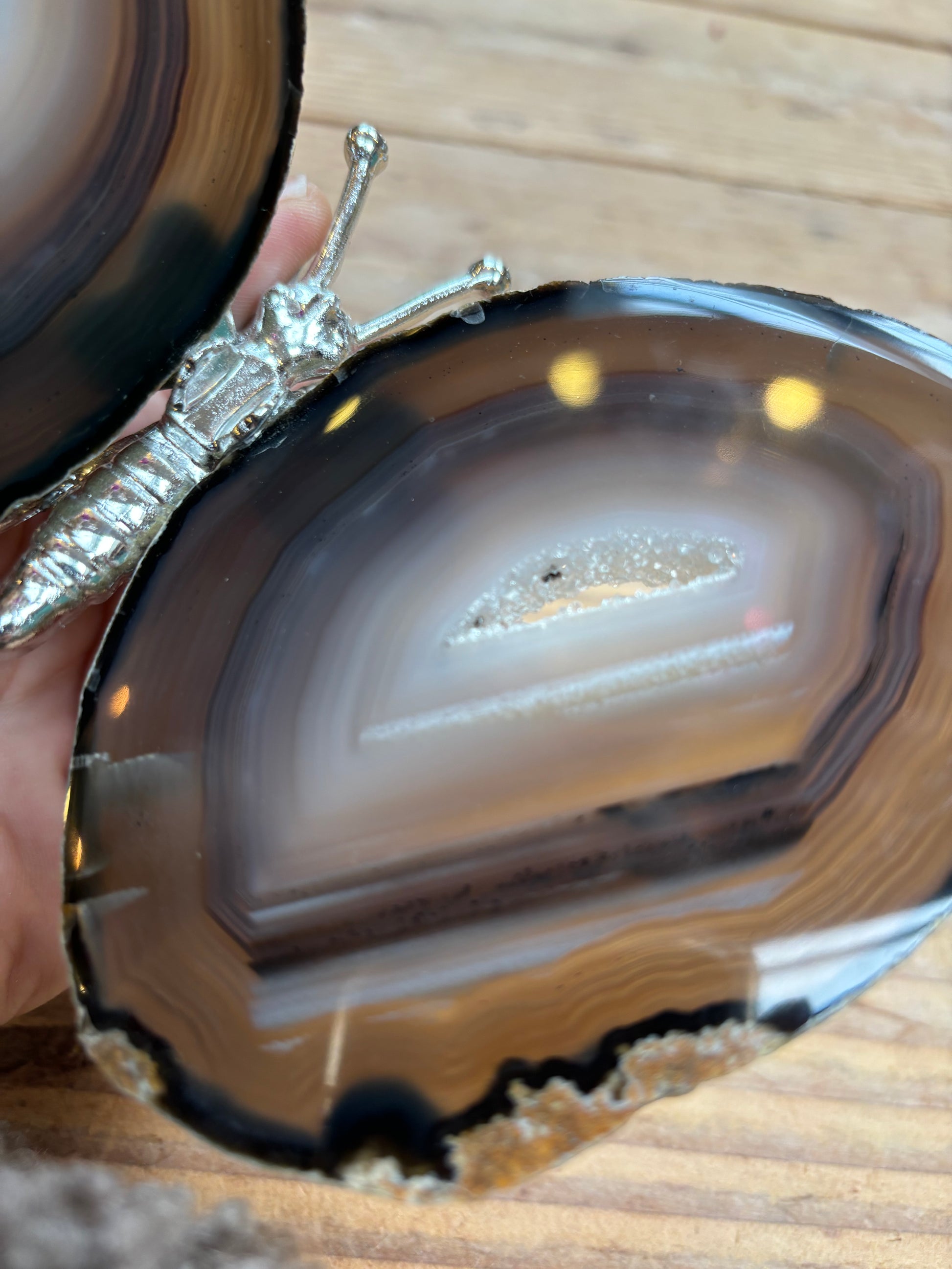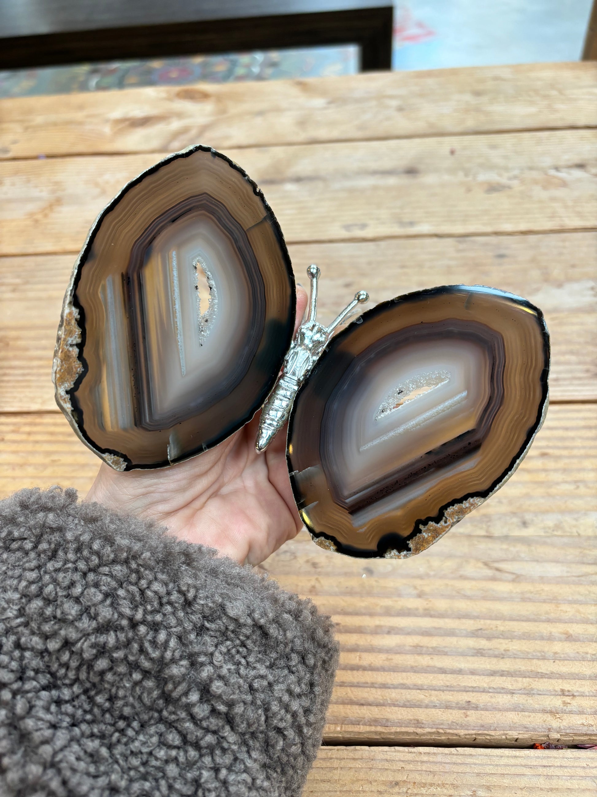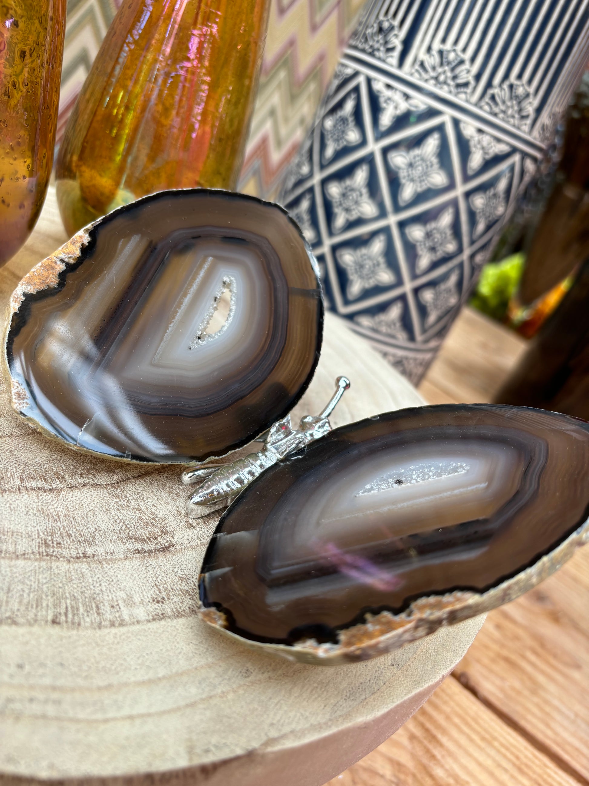 Prachtige vlinder met vleugels van agaat en een zilver lijfje. De vlinders variëren tussen de 13/16 cm breed en 12/15 cm lang.