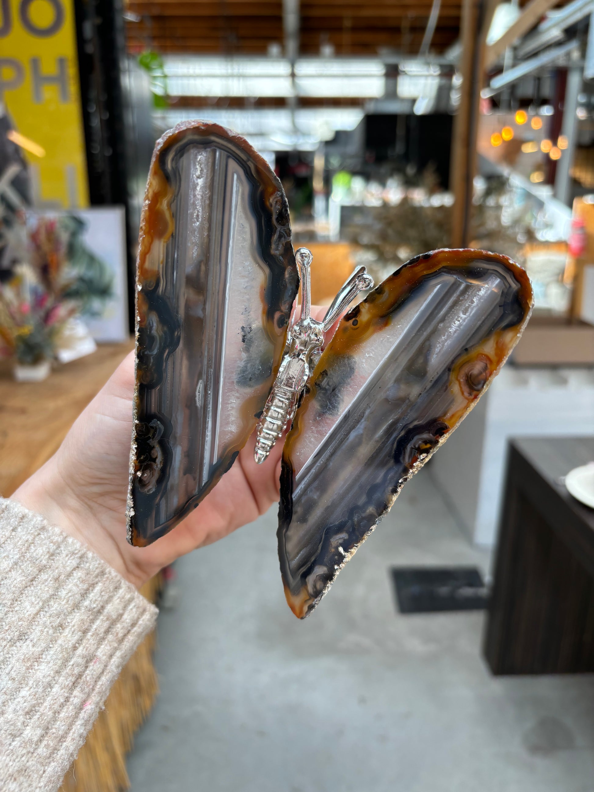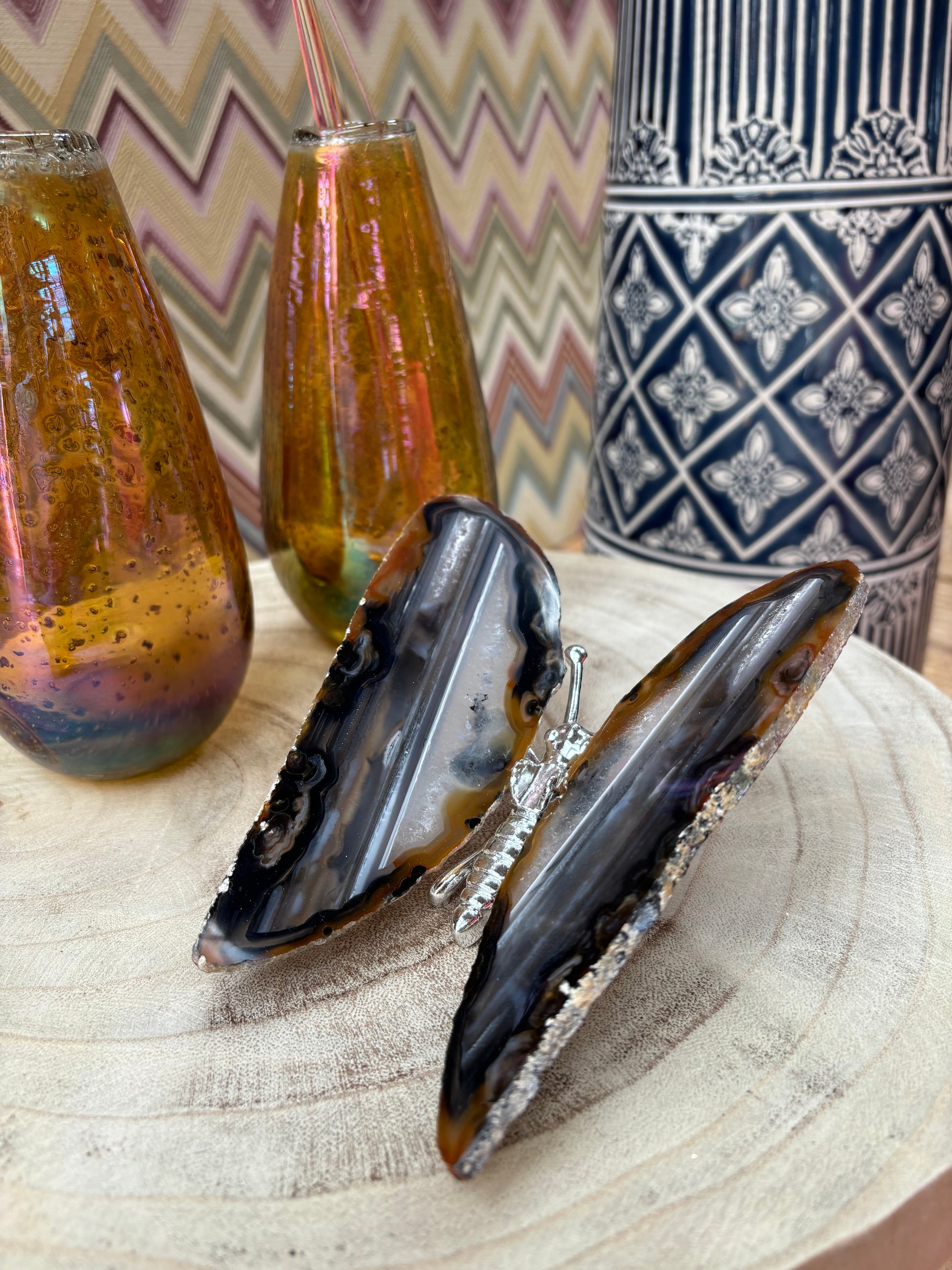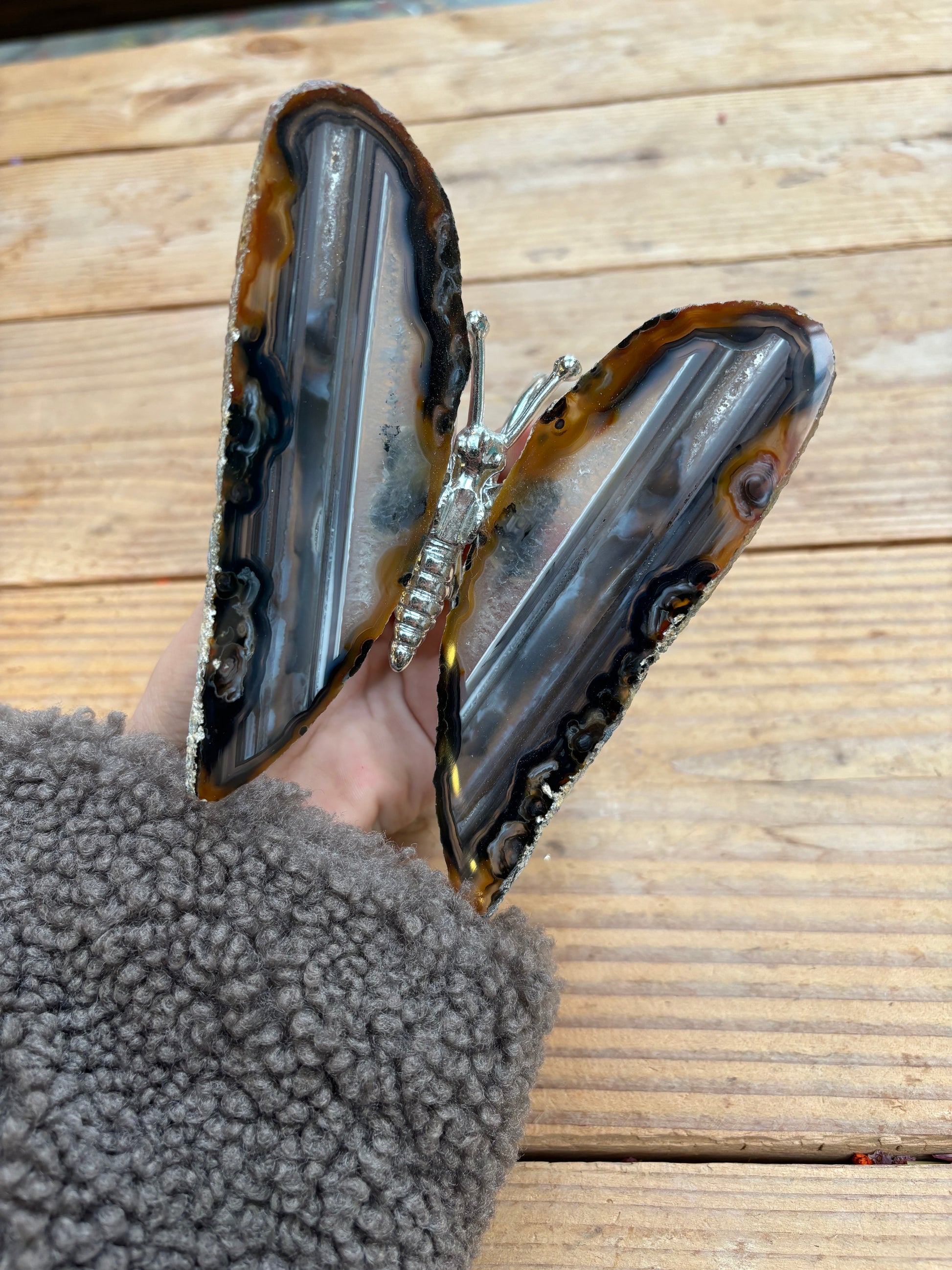 Prachtige vlinder met vleugels van agaat en een zilver lijfje. De vlinders variëren tussen de 13/16 cm breed en 12/15 cm lang.