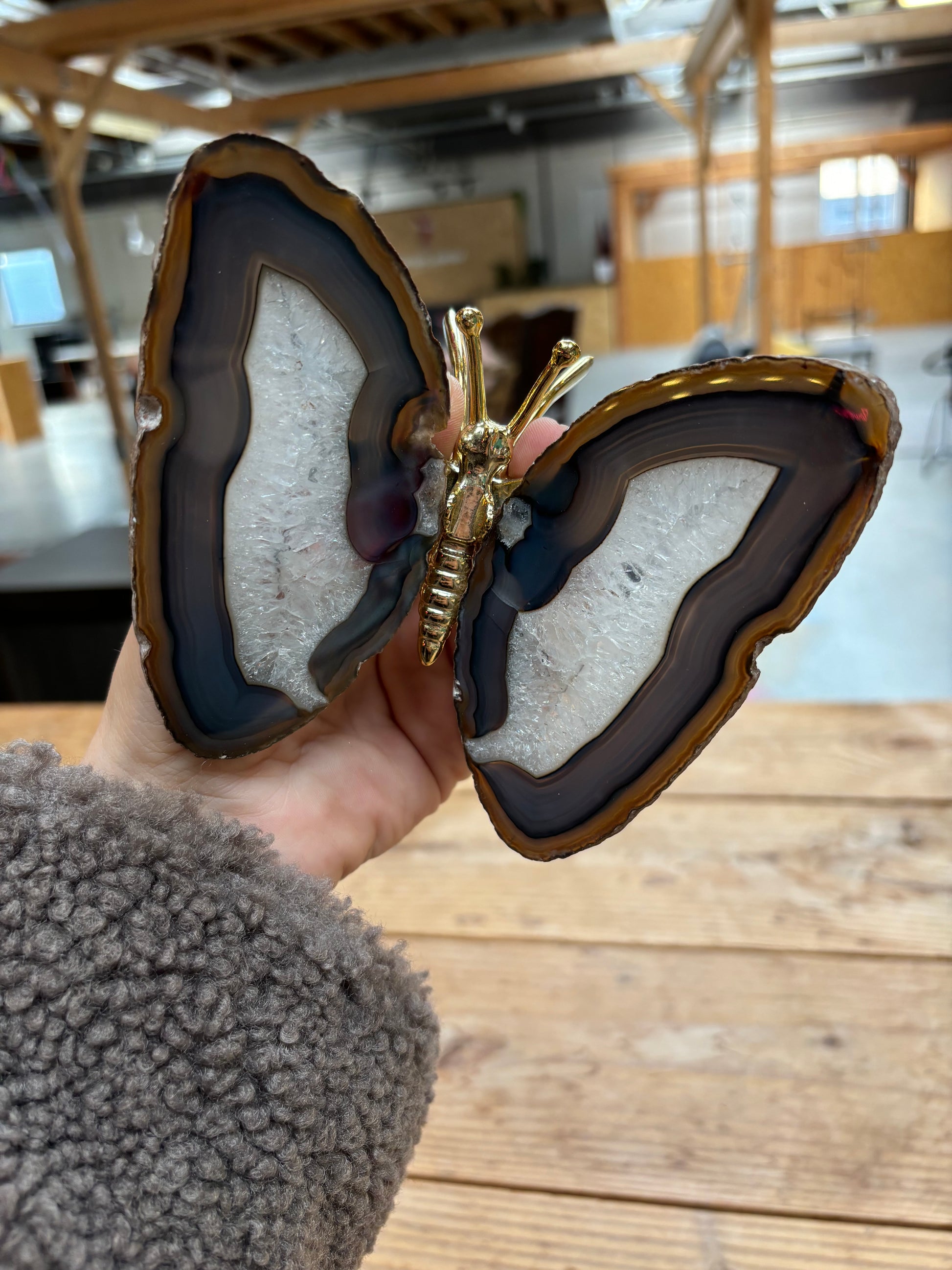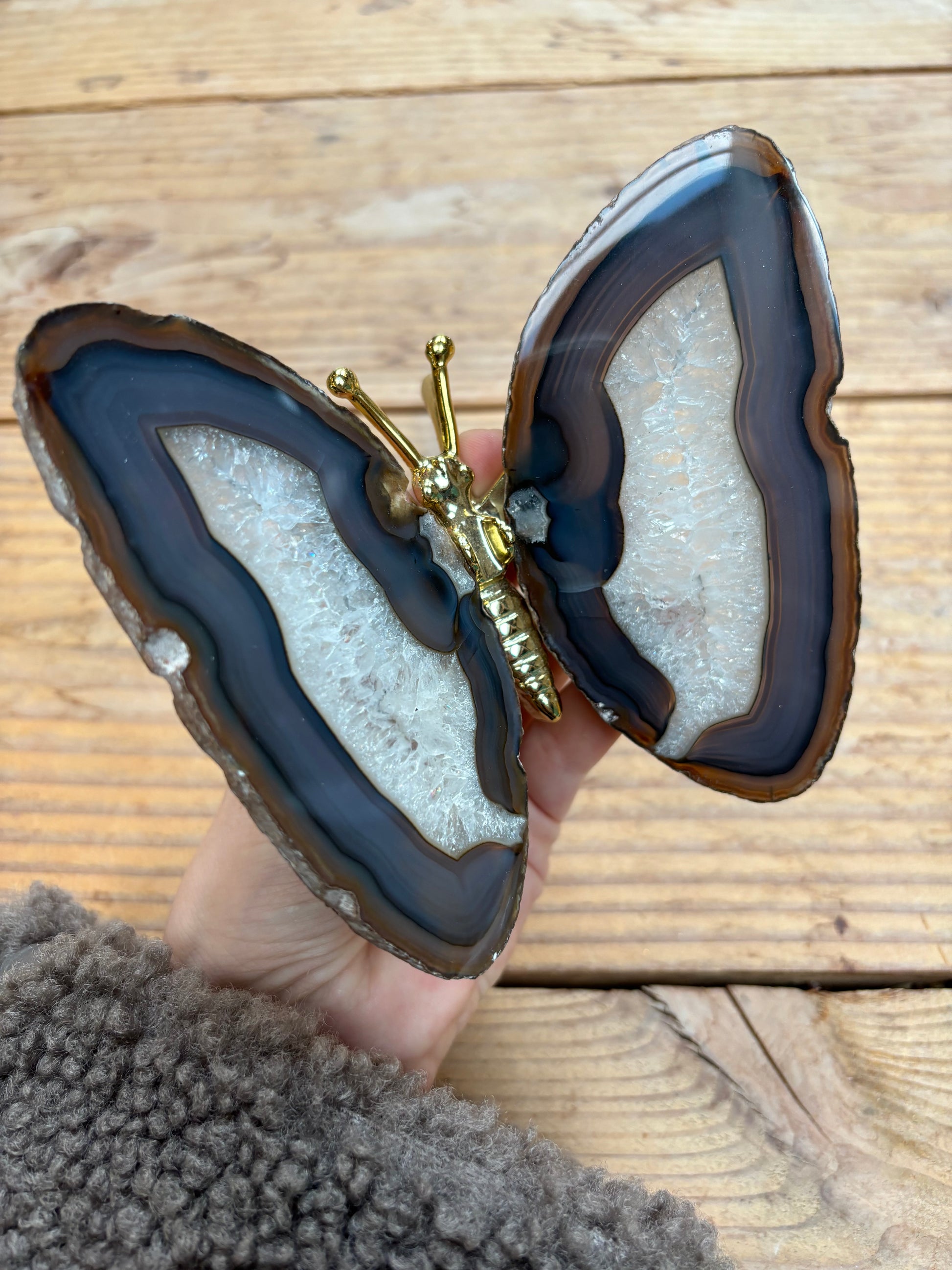 Prachtige vlinder met vleugels van agaat en een goud lijfje. De vlinders variëren tussen de 13/16 cm breed en 12/15 cm lang.