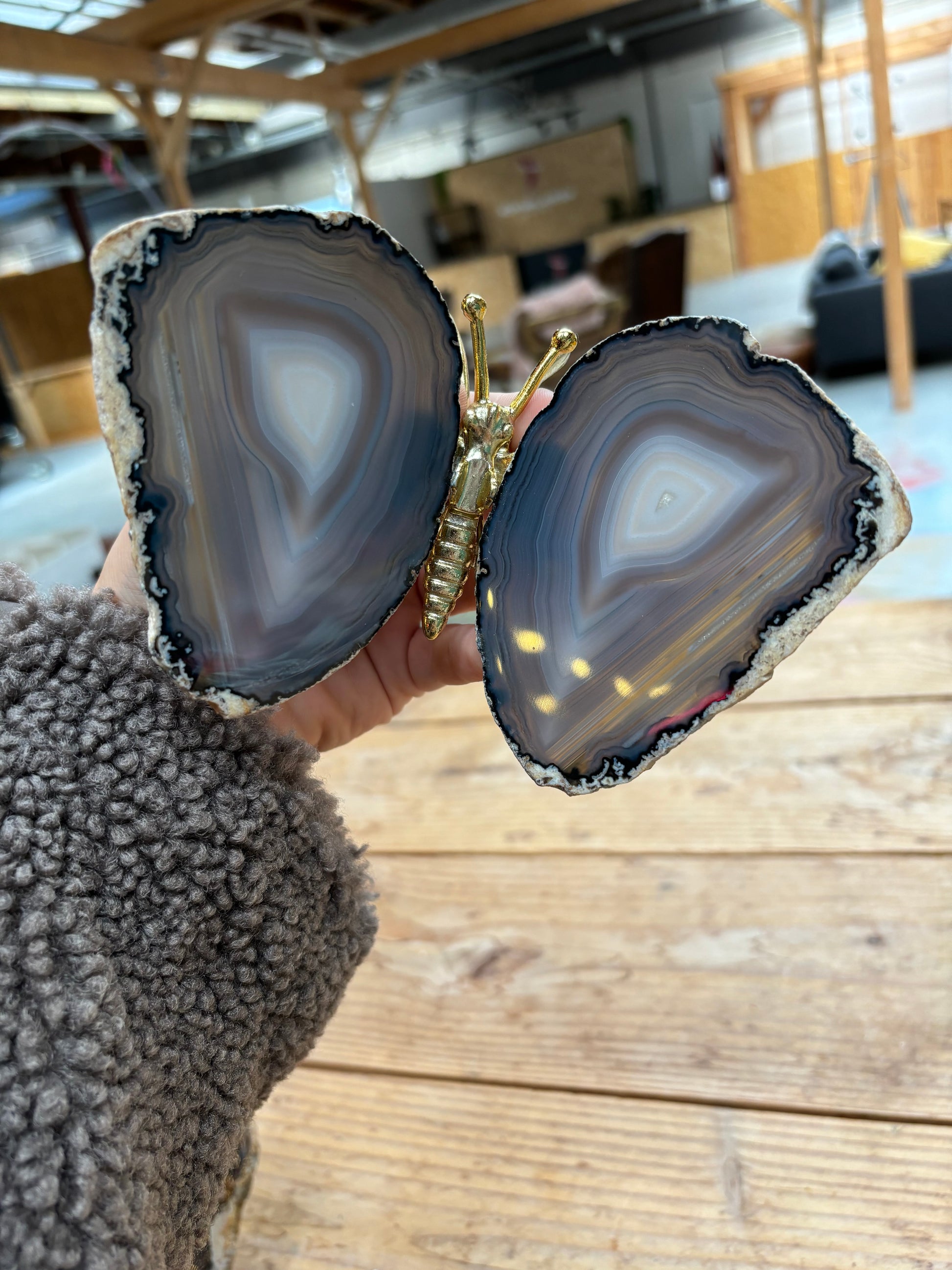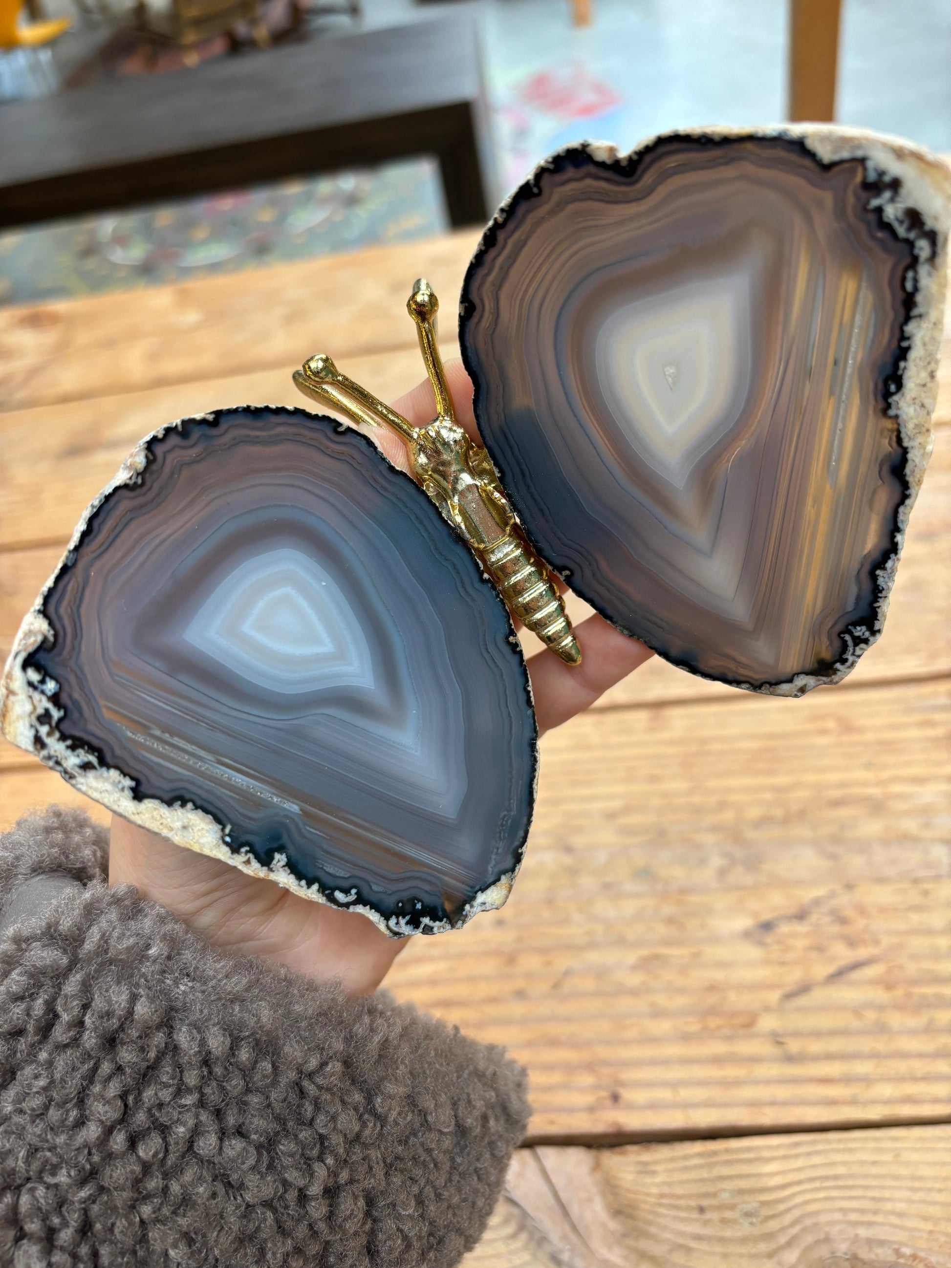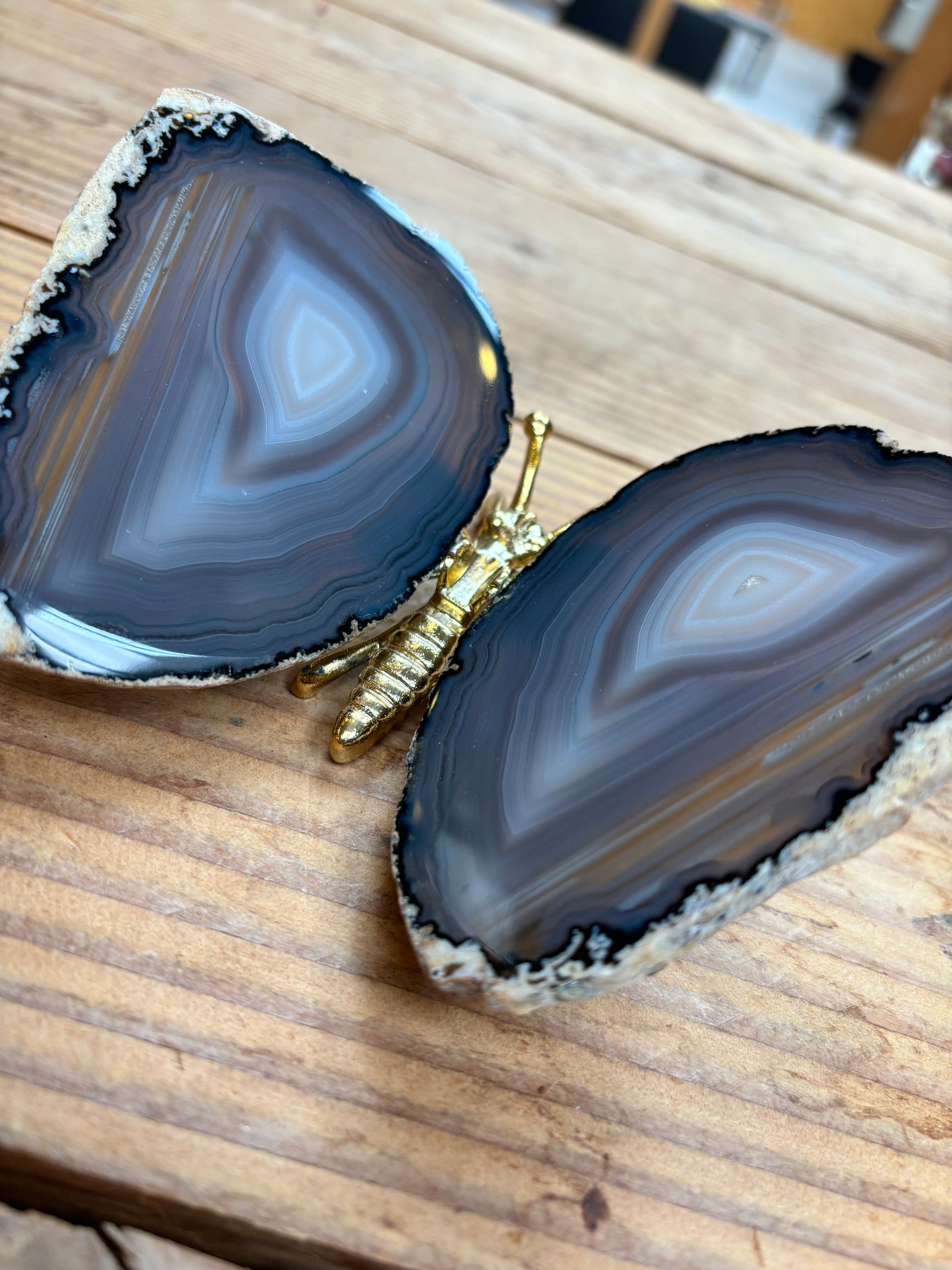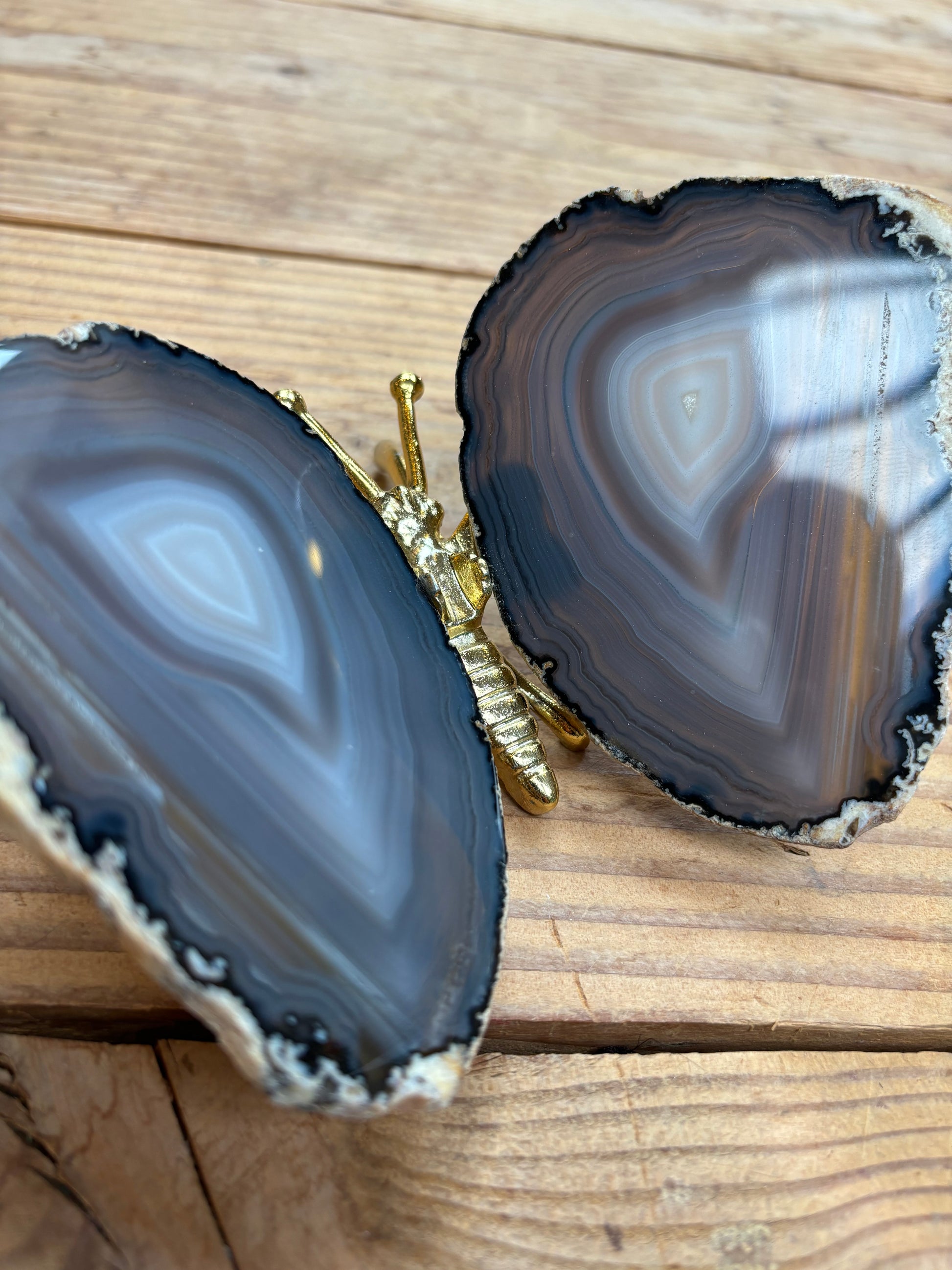 Prachtige vlinder met vleugels van agaat en een goud lijfje. De vlinders variëren tussen de 13/16 cm breed en 12/15 cm lang.