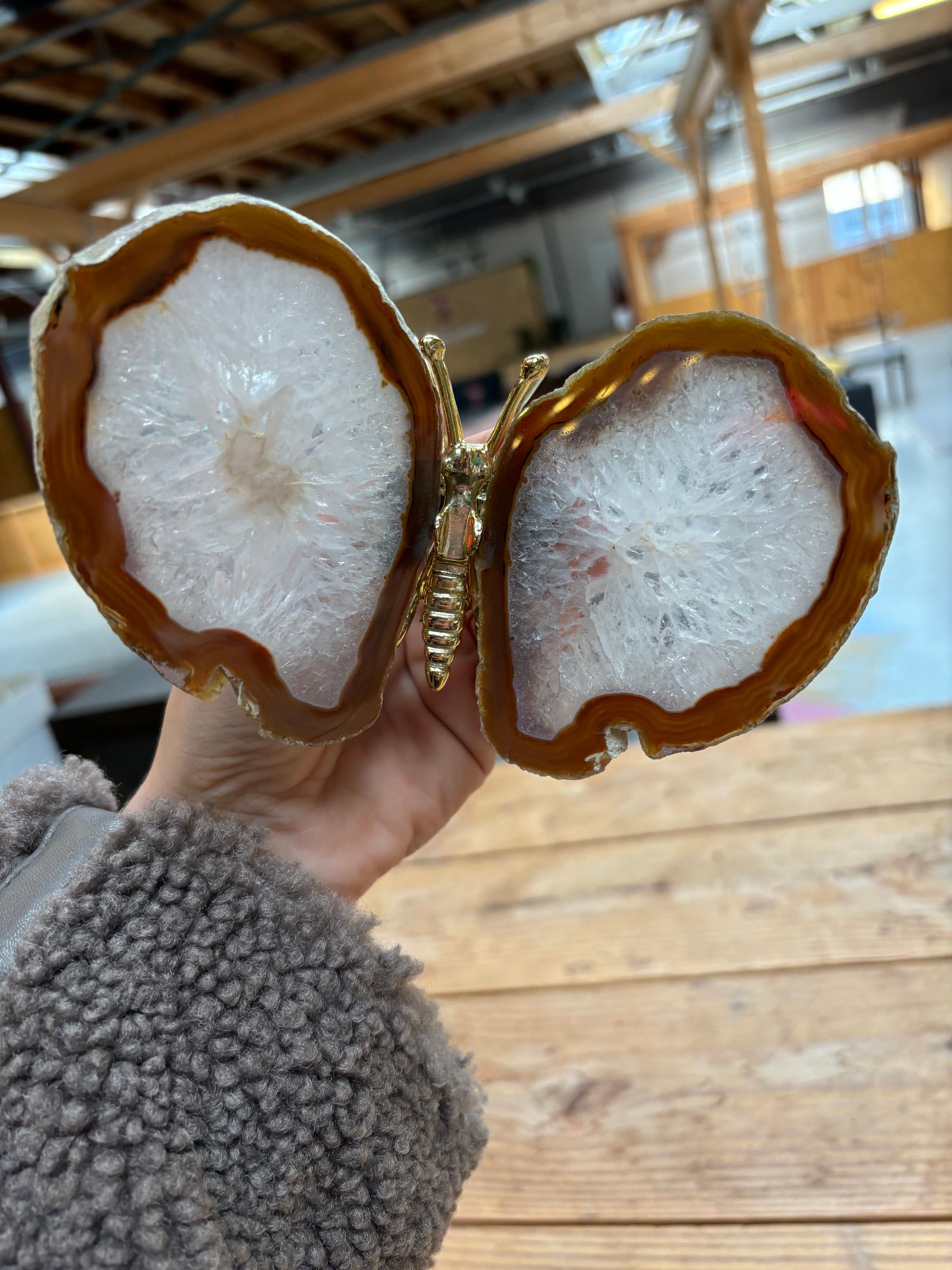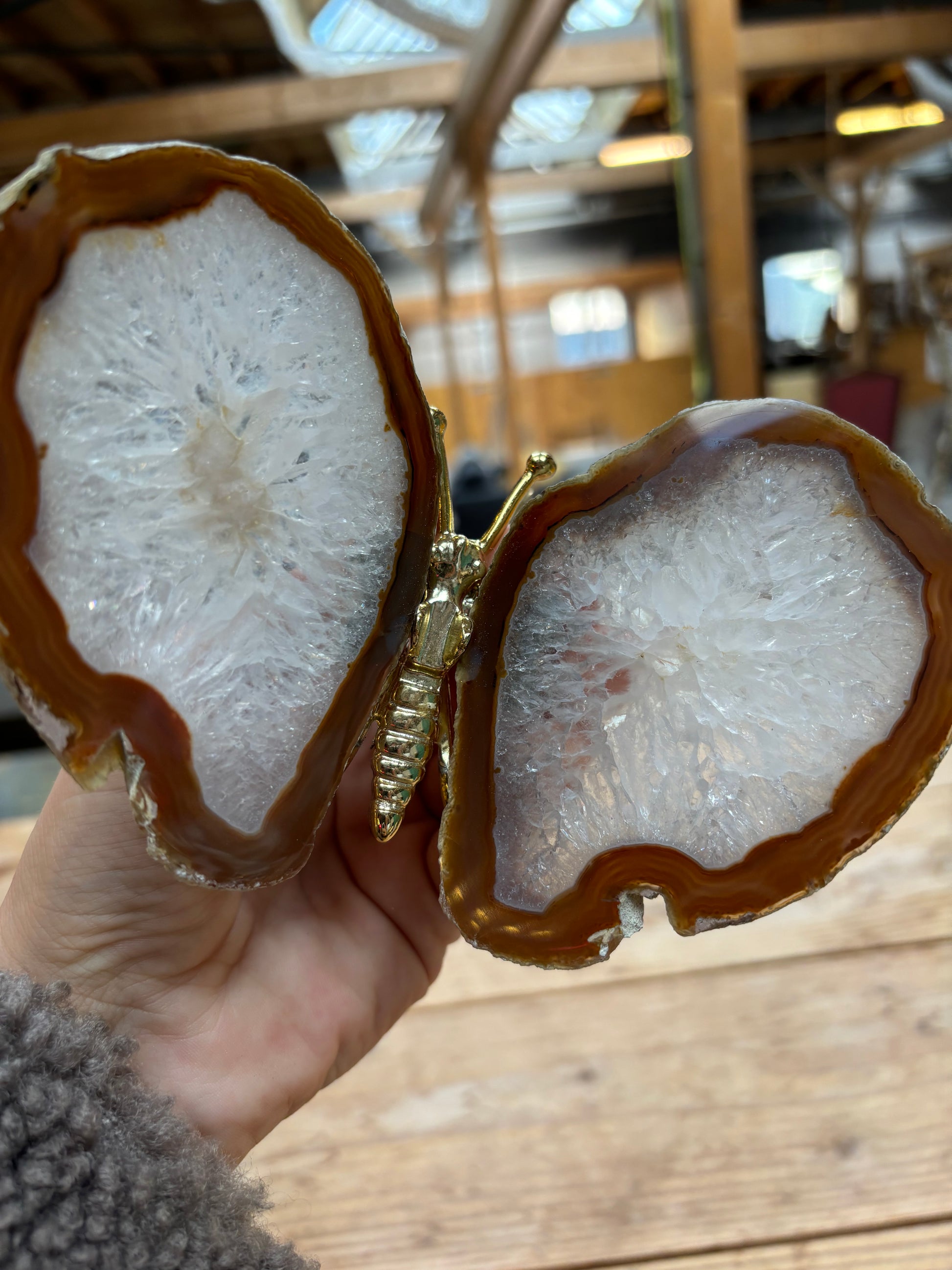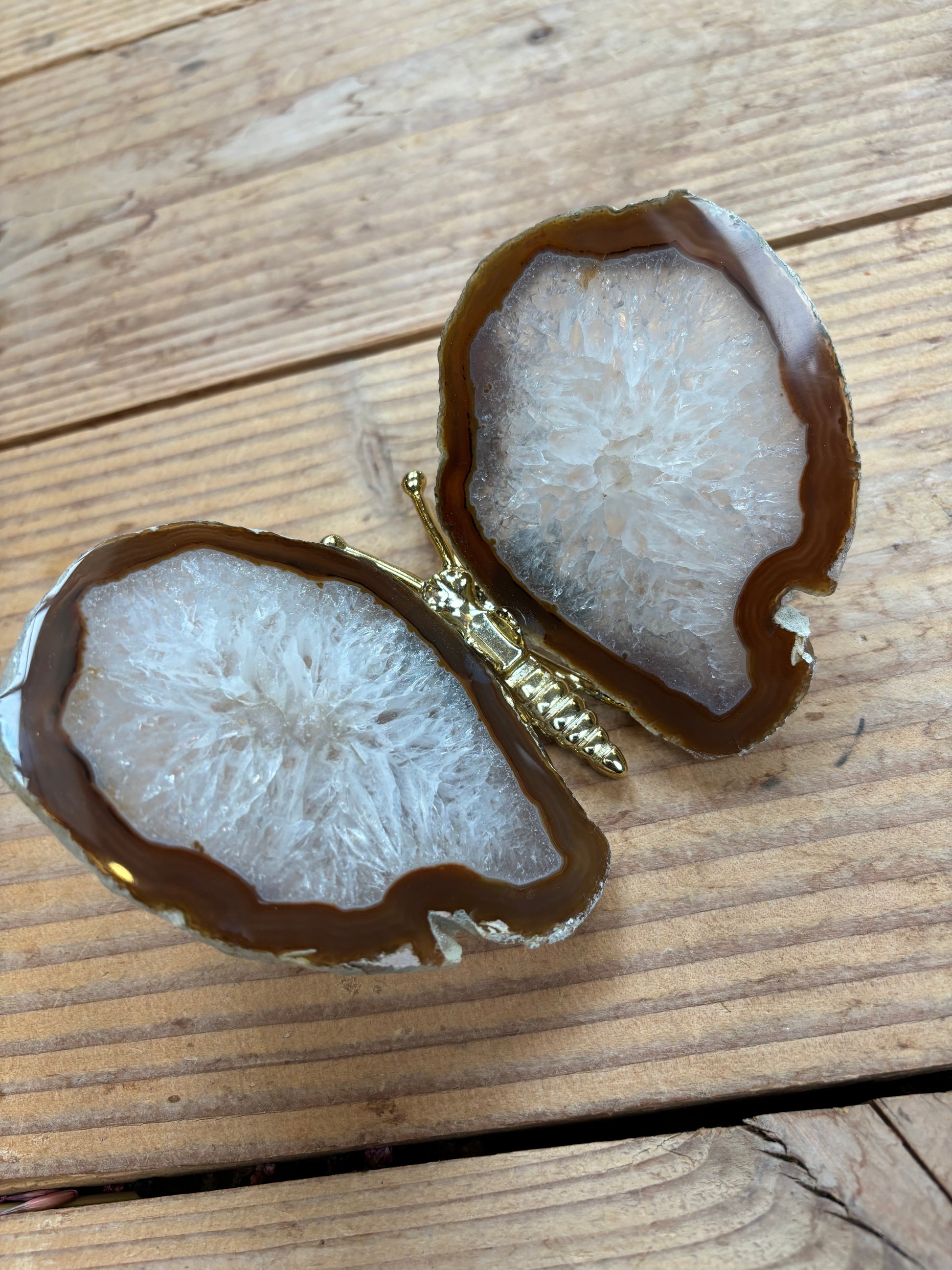 Prachtige vlinder met vleugels van agaat en een goud lijfje. De vlinders variëren tussen de 13/16 cm breed en 12/15 cm lang.