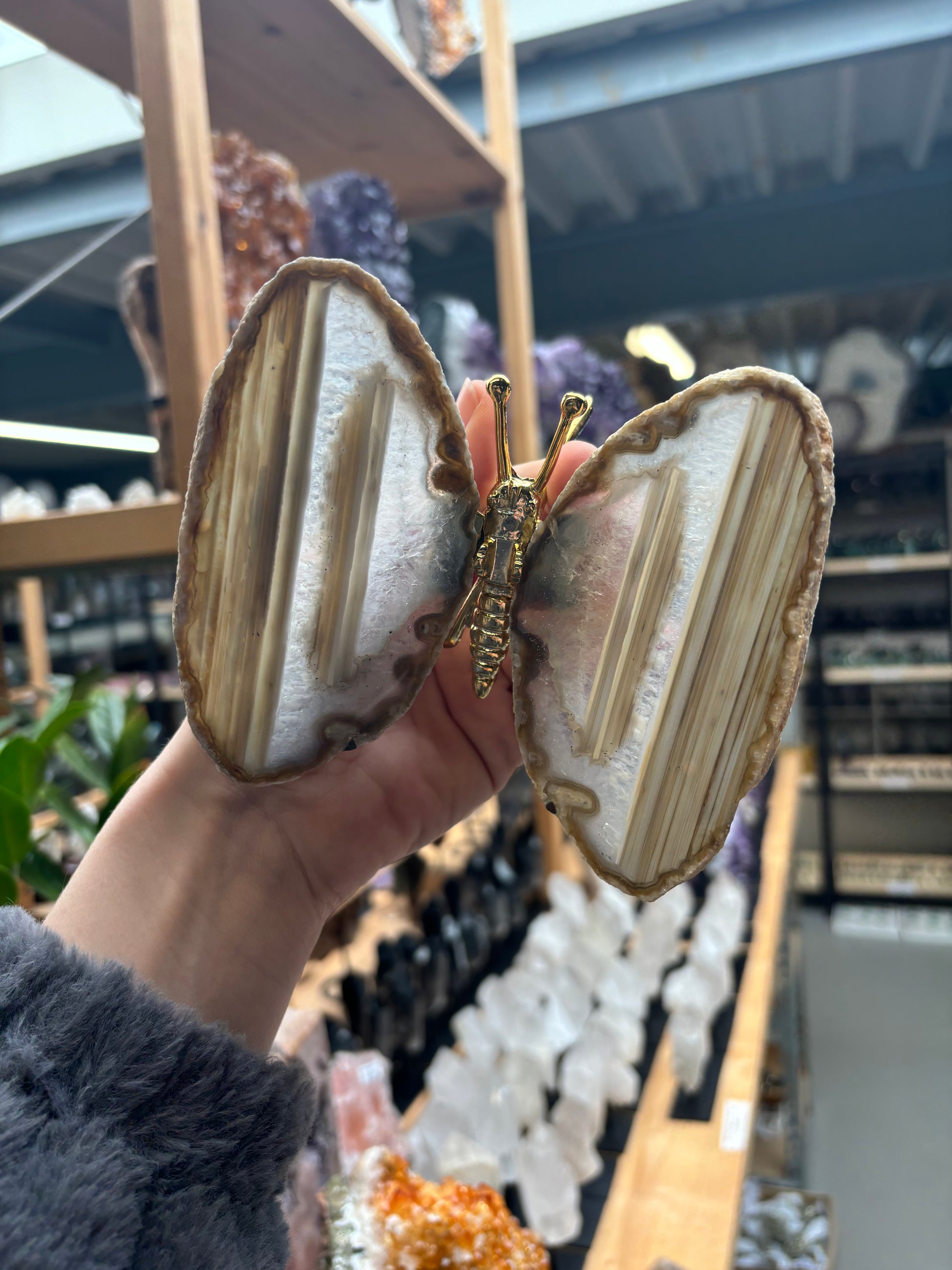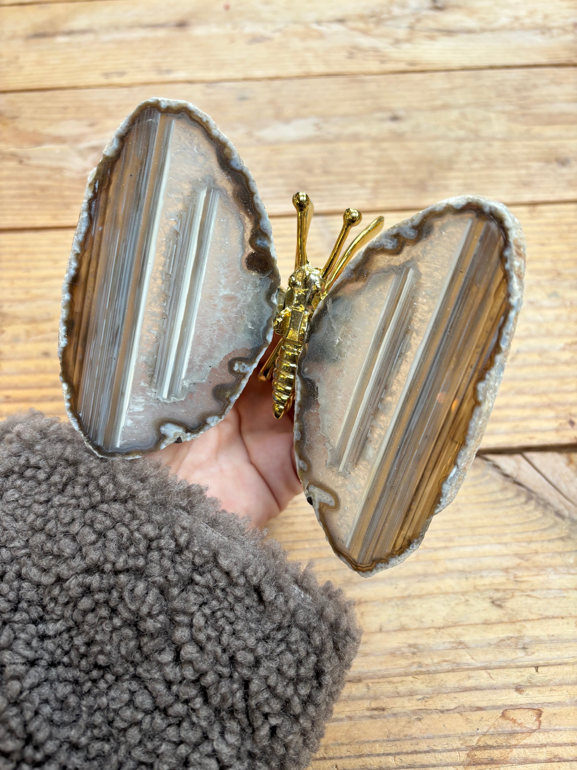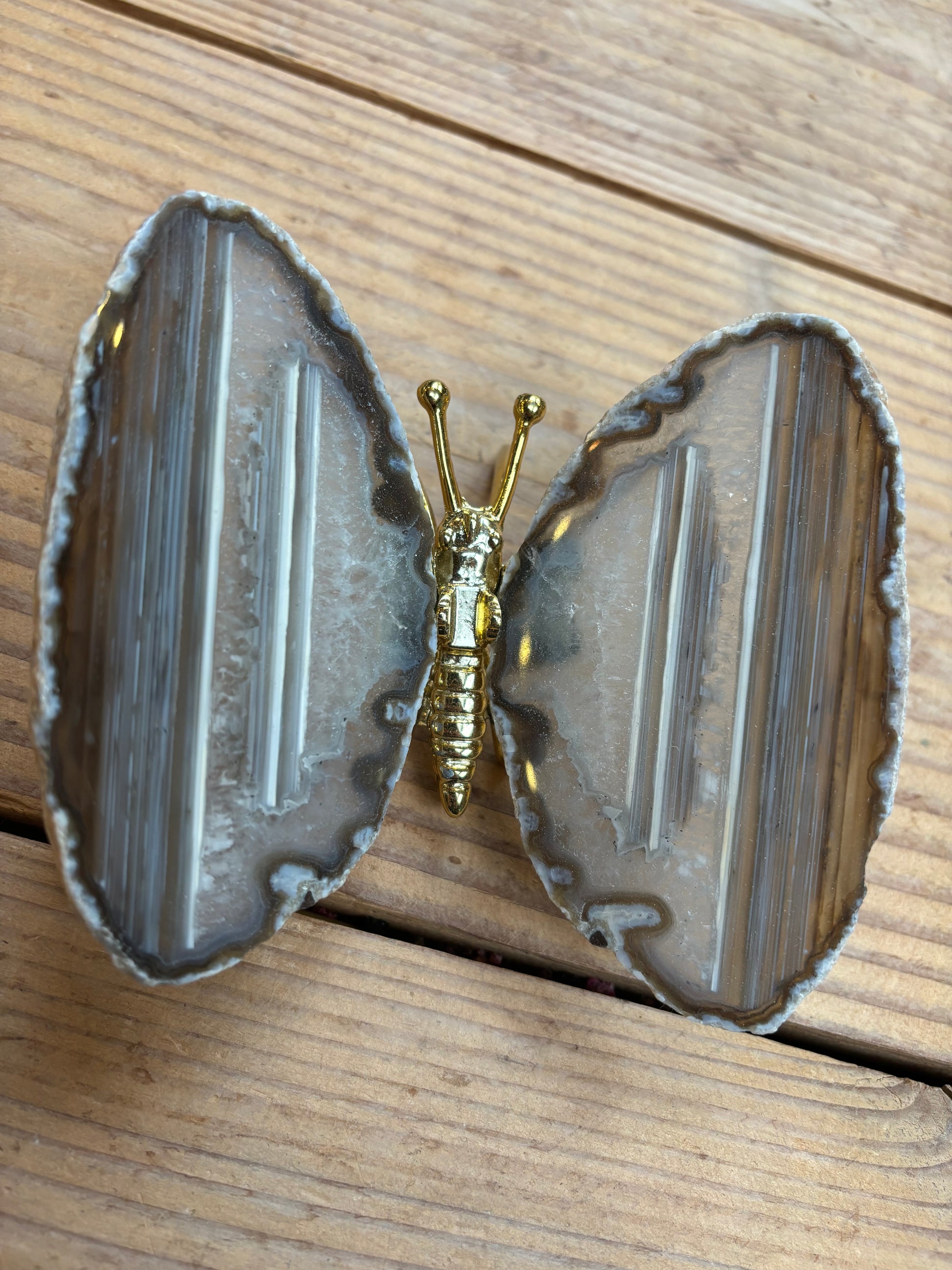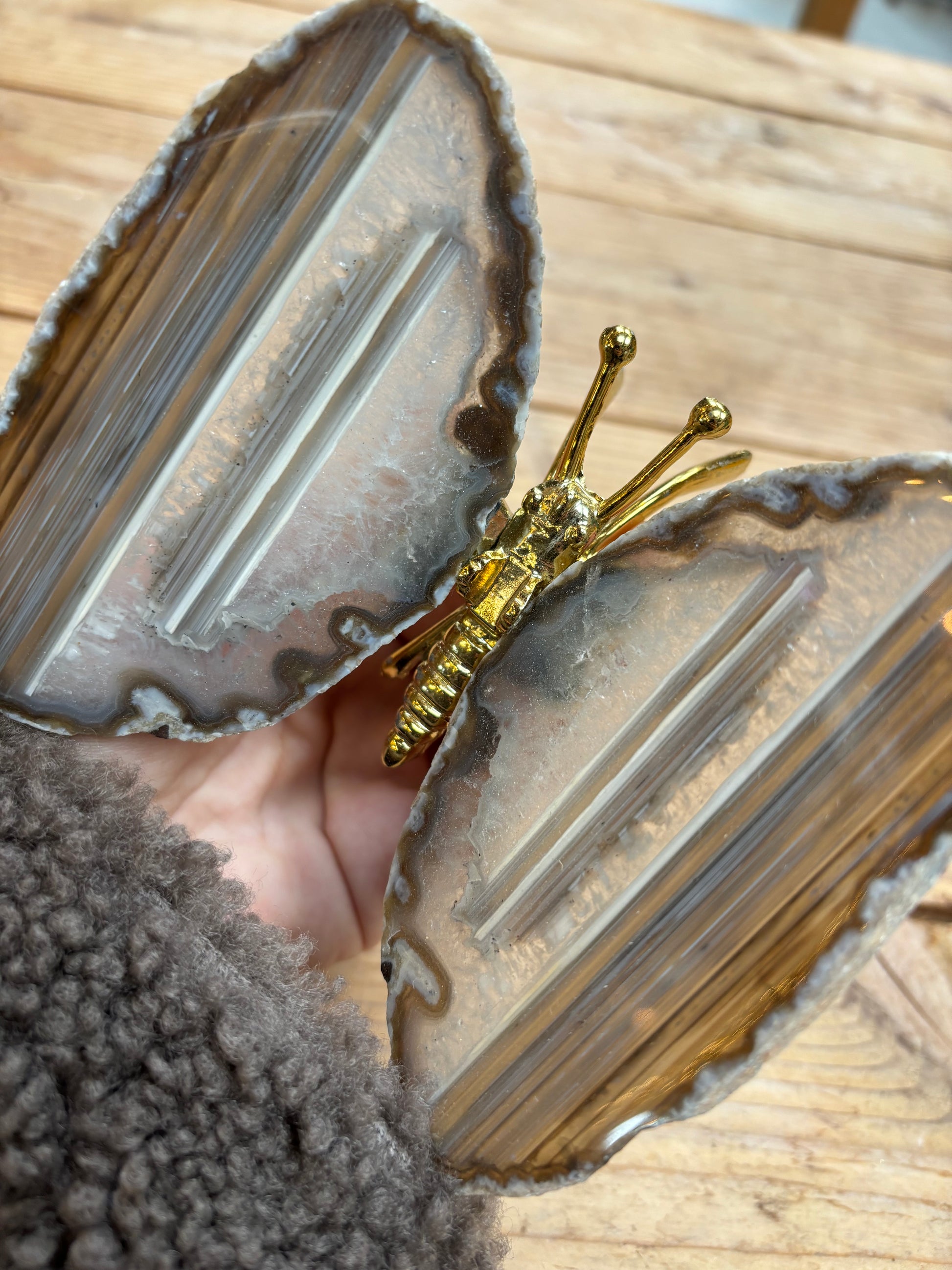 Prachtige vlinder met vleugels van agaat en een goud lijfje. De vlinders variëren tussen de 13/16 cm breed en 12/15 cm lang.