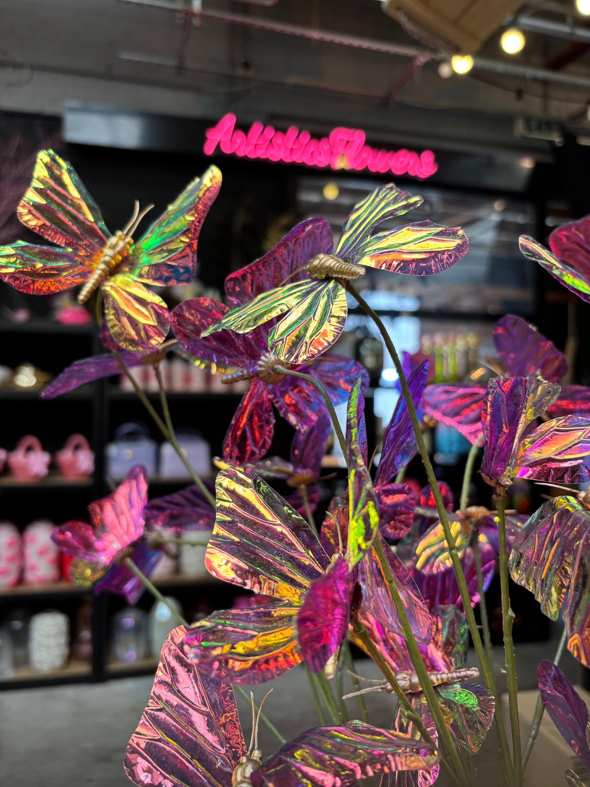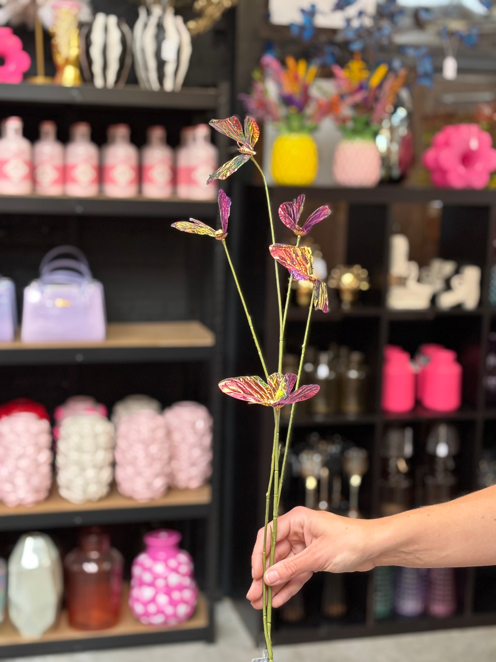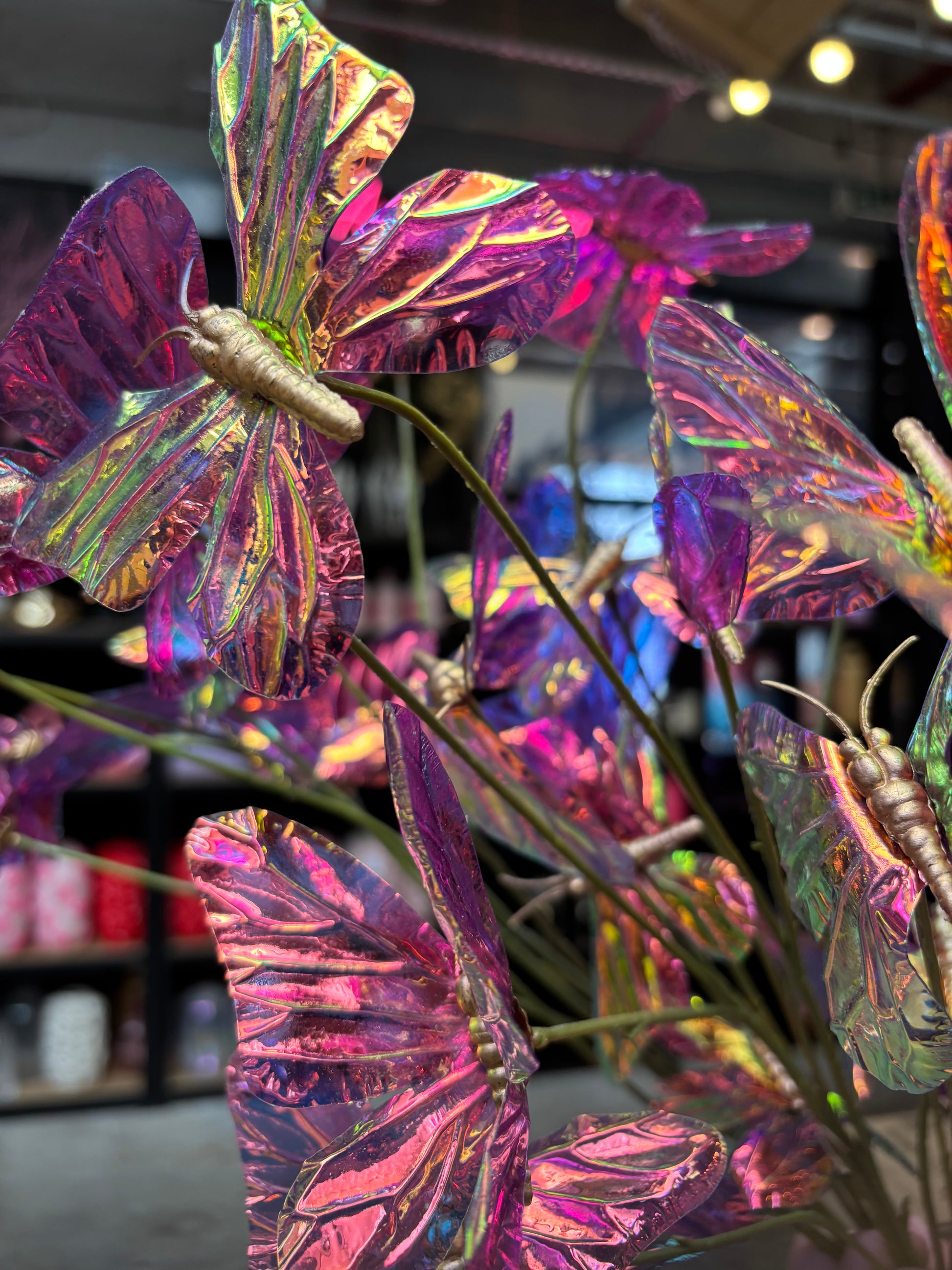 ✨Magie in elke beweging ✨ Deze zijde vlindertakken veranderen van kleur in het licht. Metallic, betoverend en steeds anders 🦋 Per tak 5 vlinders, hoogte 75 cm.